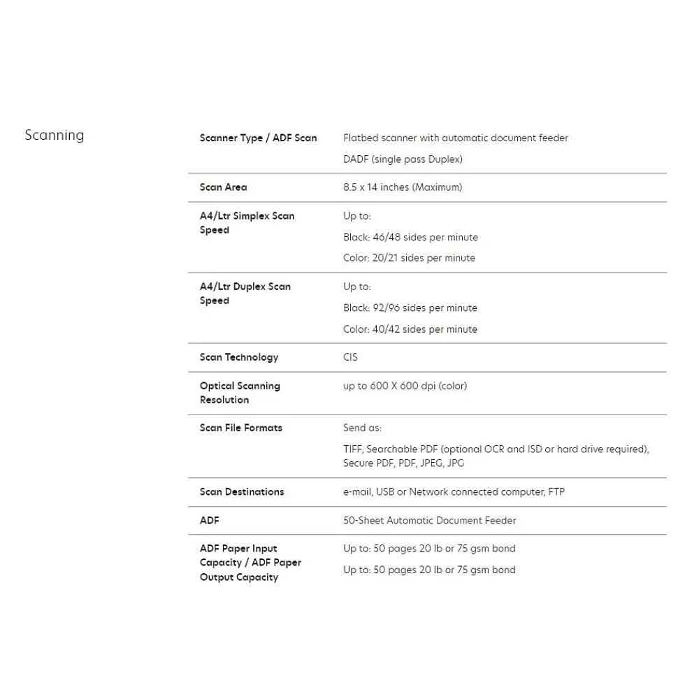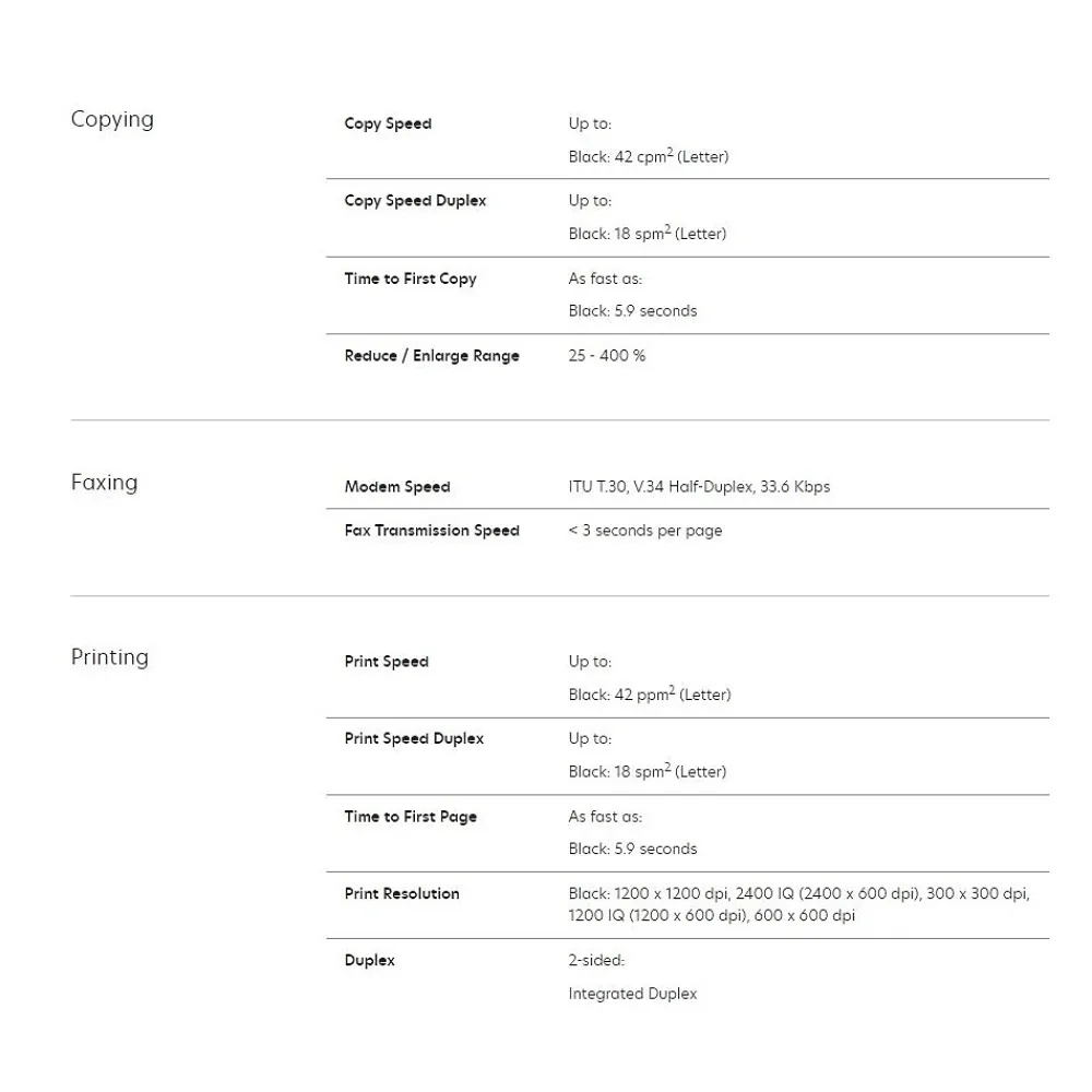 Maximum Print Speed (Black): 42 ppm; Print Resolution (Black) (Width x Height): 600 x 600 dpi; B&W or Color Output: B&W; Printing Type: Laser.