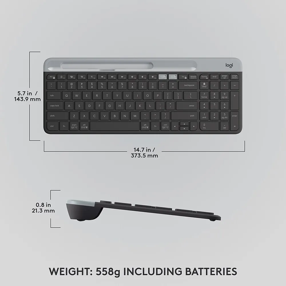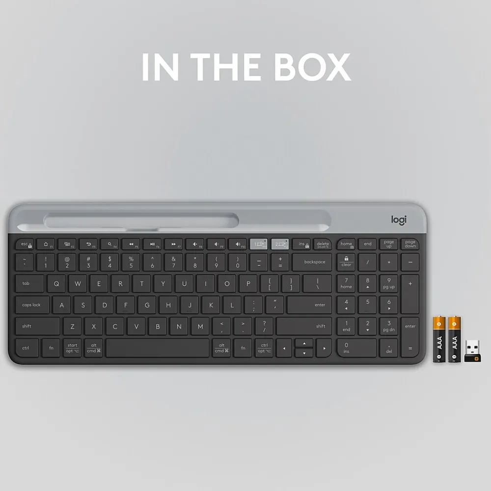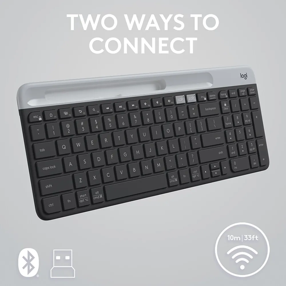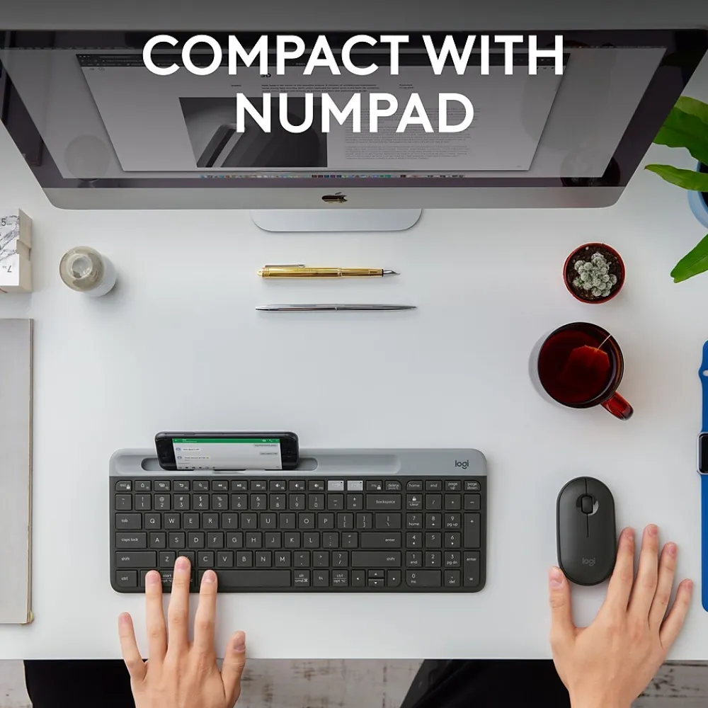 Own your space with the K585 Slim Multi-Device – an ultra-thin and design-forward keyboard perfect for simultaneously typing your ideas on your laptop and a text on your smartphone. Type across computers, tablets, and smartphones from one keyboard for one seamless workflow — with a built-in phone cradle for easier multitasking. The compact design integrates a number pad and media shortcuts, so you can work efficiently and comfortably in tight spaces.The quiet low-profile keys offer fluid, laptop-like typing, while an auto-sleep feature reserves battery life, so you can power through your work.
