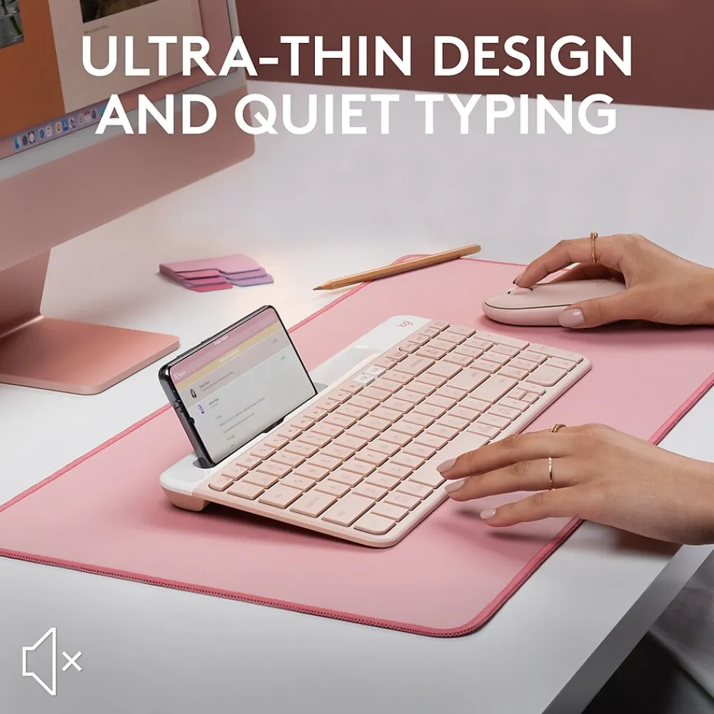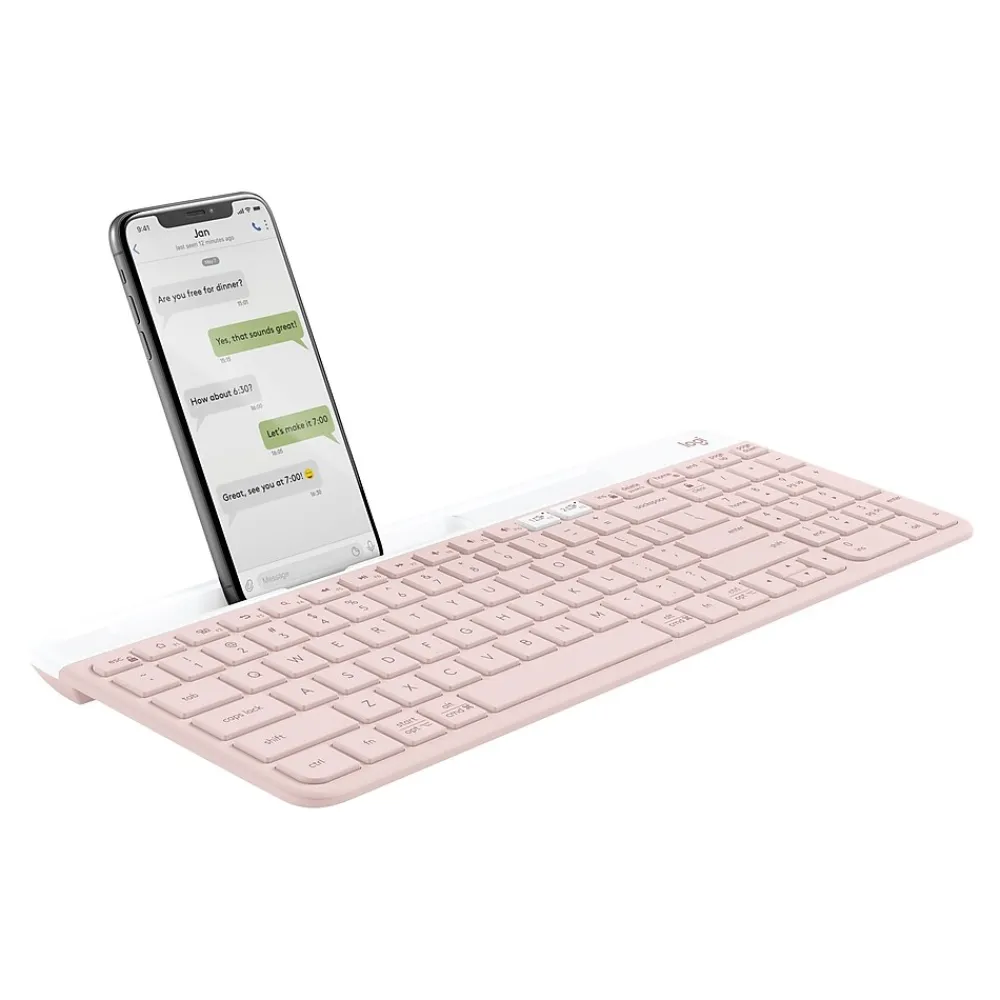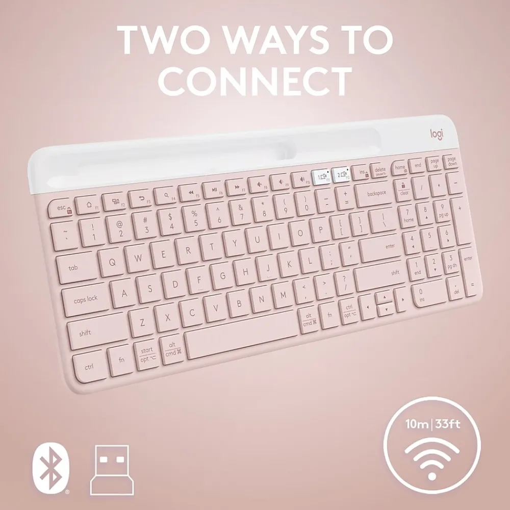Own your space with the K585 Slim Multi-Device – an ultra-thin and design-forward keyboard perfect for simultaneously typing your ideas on your laptop and a text on your smartphone. Type across computers, tablets, and smartphones from one keyboard for one seamless workflow — with a built-in phone cradle for easier multitasking. The compact design integrates a number pad and media shortcuts, so you can work efficiently and comfortably in tight spaces. The quiet low-profile keys offer fluid, laptop-like typing, while an auto-sleep feature reserves battery life, so you can power through your work.
