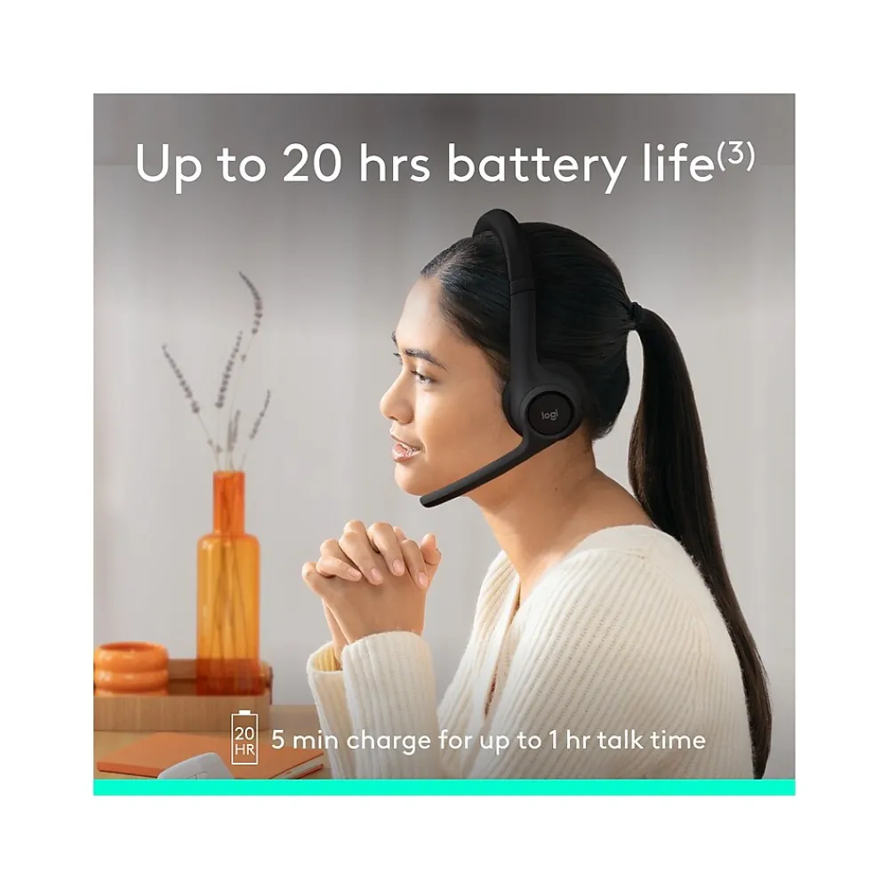 The Logitech Zone Vibe 300 is an essential wireless headset with great audio quality for work and downtime. Move freely about your home or office and stay reliably connected with multipoint Bluetooth up to 98′ away. Meet with anyone on your preferred calling platform. Dual noise-canceling mics on the extended mic boom suppress background sound and allow others to hear you clearly. Enhanced speakers allow you to hear just as well. With its plastic parts made with a minimum of 55% recycled plastic (excluding printed wiring assembly, cables, and packaging), the Zone Vibe 300 is a choice you’ll feel good about.