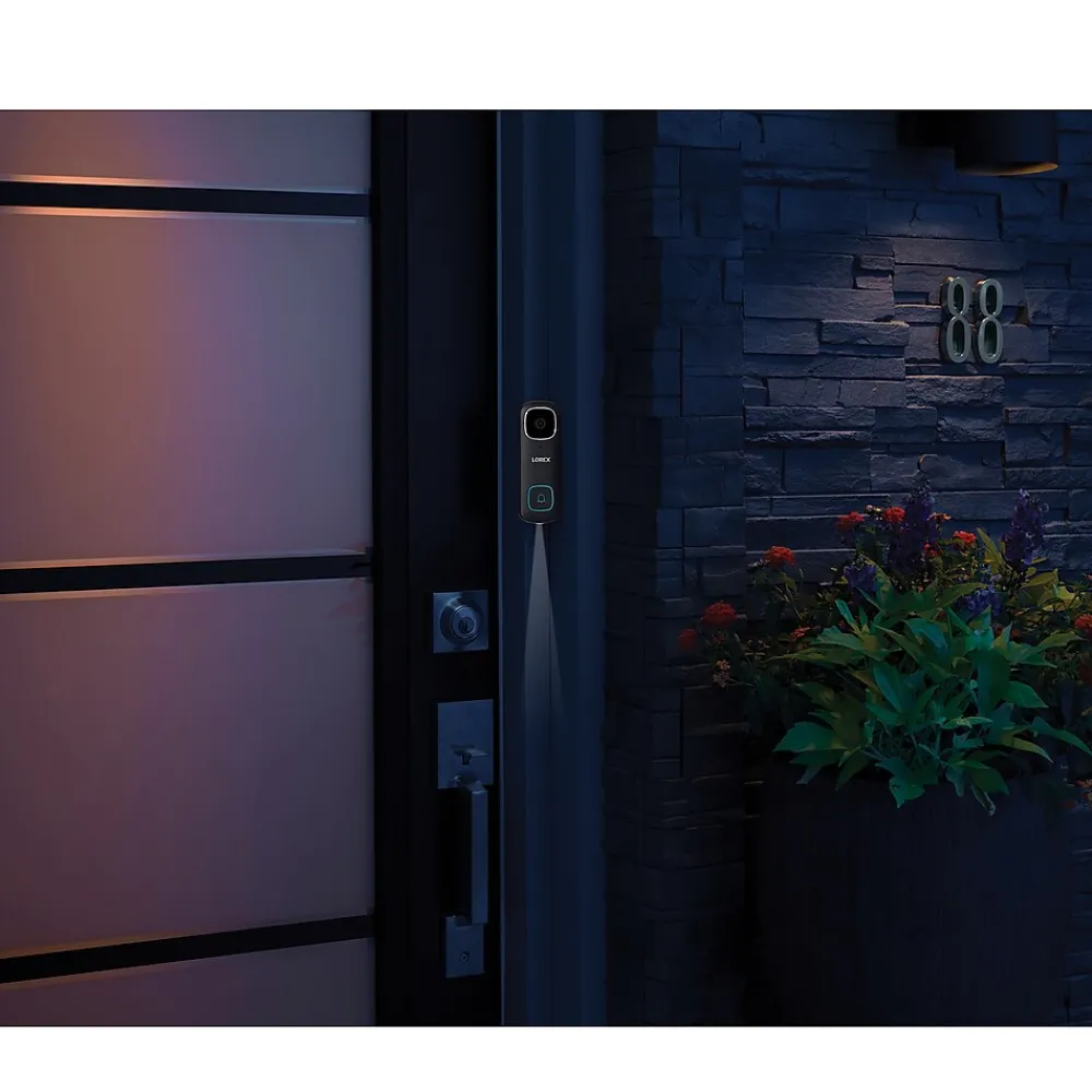 See who’s at the door even when you are away, play prerecorded messages when someone rings, talk to those on the other side, and greet guests with the night-light all with the Black Lorex 2K QHD Wired Smart Video Doorbell. With impressive 2K resolution recording, an ultra-wide-angle lens, HDR imaging, and highly detailed video both day and night, this doorbell offers both performance and convenience. Be aware of activity around your doorstep with Person Detection, which notifies you when motion from a person is detected. The 2-way talk feature, using the Lorex Home app, lets you talk through the doorbell, greet visitors using 1 of 3 quick responses, or record your own custom message. Local storage with the included WD purple microSD Card means you have no monthly fees and ample storage to keep your recordings safe and secure.