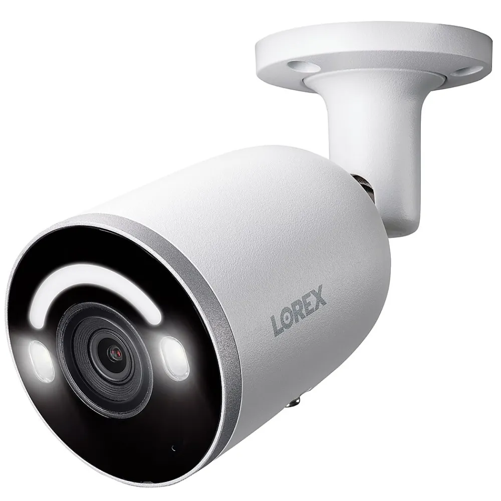 Get the best view of your property—day and night—with the Lorex 4K Smart Deterrence IP Wired Bullet Camera. Always know what’s happening around your property with Person, Package, Animal, and Vehicle Detection. Get detailed smartphone notifications to the Lorex Home app when someone arrives at your door, when a package is delivered, a pet has wandered outside, or when a car pulls into the driveway. Now you can be proactive with your security—deter unwelcome visitors with the motion-activated LED lights and remote-triggered siren. Speak to your guests with 2-way talk using the built-in microphone and speaker. If you’re busy, answer instantly with the preset Quick Responses. You can also customize your security using the LED Smart Security Lighting located above the camera lens. Choose from 16.7 million colors to assign various colors to different motion events and camera modes. See full-color video, even at night, with Color Night Vision Booster. Pair this wired security camera with a compatible Lorex 4K Fusion NVR and the Lorex Home app to enhance your home monitoring.