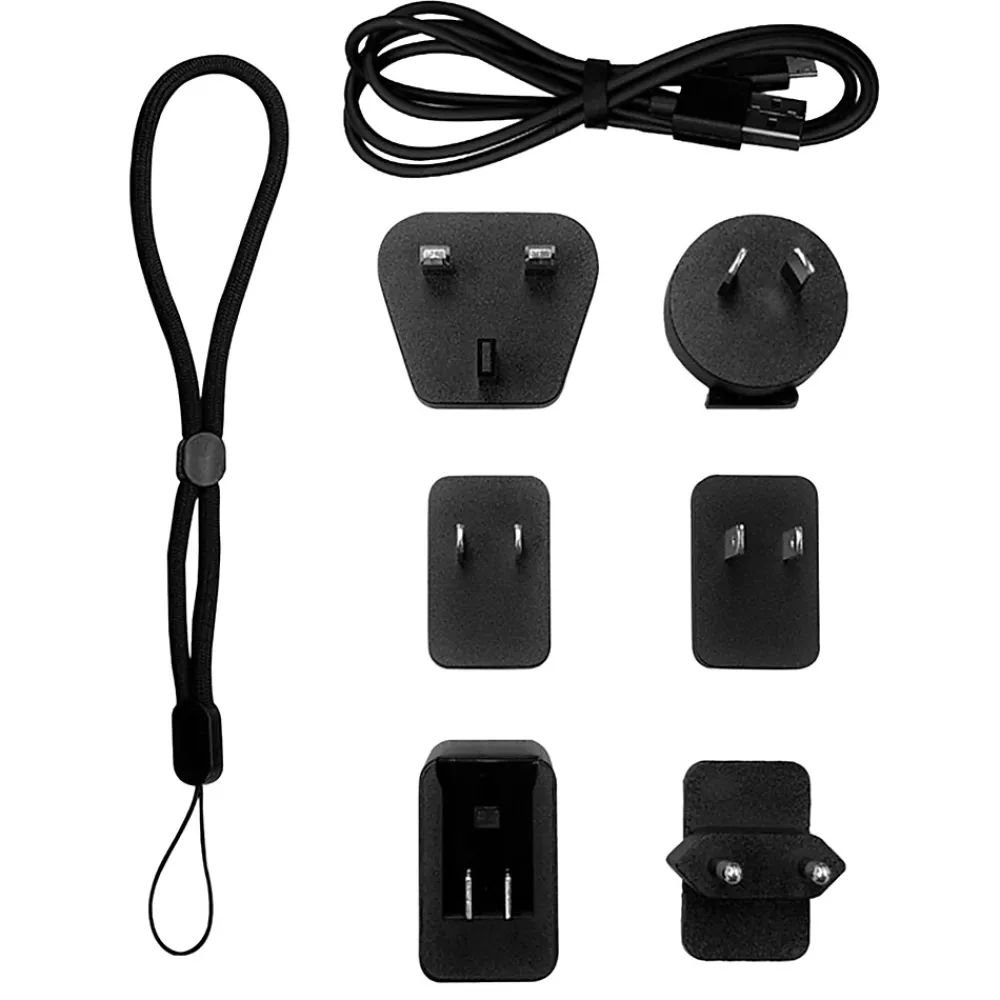 - Includes USB cable, power adapter, power plugs for US, UK, AU, and EU, pouch, lanyard, and quick-start guide insert