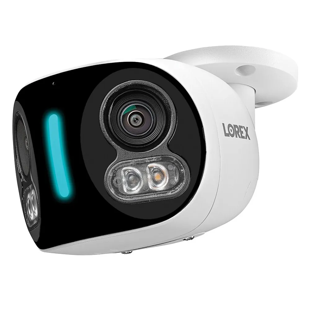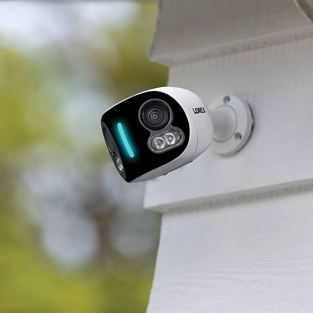 Increase your security coverage with a complete 180° panoramic view with this Lorex Wi-Fi 4K Dual-Lens Smart Security Camera with Smart Security Lighting! With 4K clarity, Color Night Vision, Smart Security Lighting, dual 5.0 MP lens that stitch the 2 views into a single 180° view, and more, this camera provides complete coverage — day and night. Motion-activated lights, a 110 dB warning siren, and 2-way talk through the Lorex app provide an added layer of security and can help deter unwanted visitors. It comes with a 32 GB microSD Card for local recording (upgradable to 256 GB) but it can also record to your D863 or D881 Lorex Fusion NVR (sold separately).