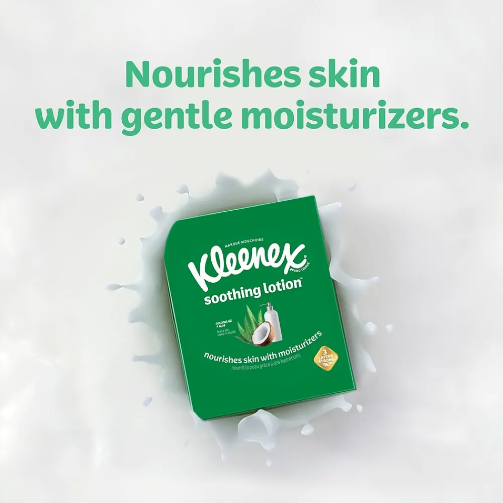 Wipe the skin delicately with these soft fragrance-free two-ply facial tissues. The moisturizing properties of aloe vera and vitamin E keep the skin hydrated and healthy. Each flat box in this four-pack of Kleenex soothing lotion facial tissues contains 120 two-ply sheets for lasting supply in dressing rooms, luxury hotel rooms or bathrooms.