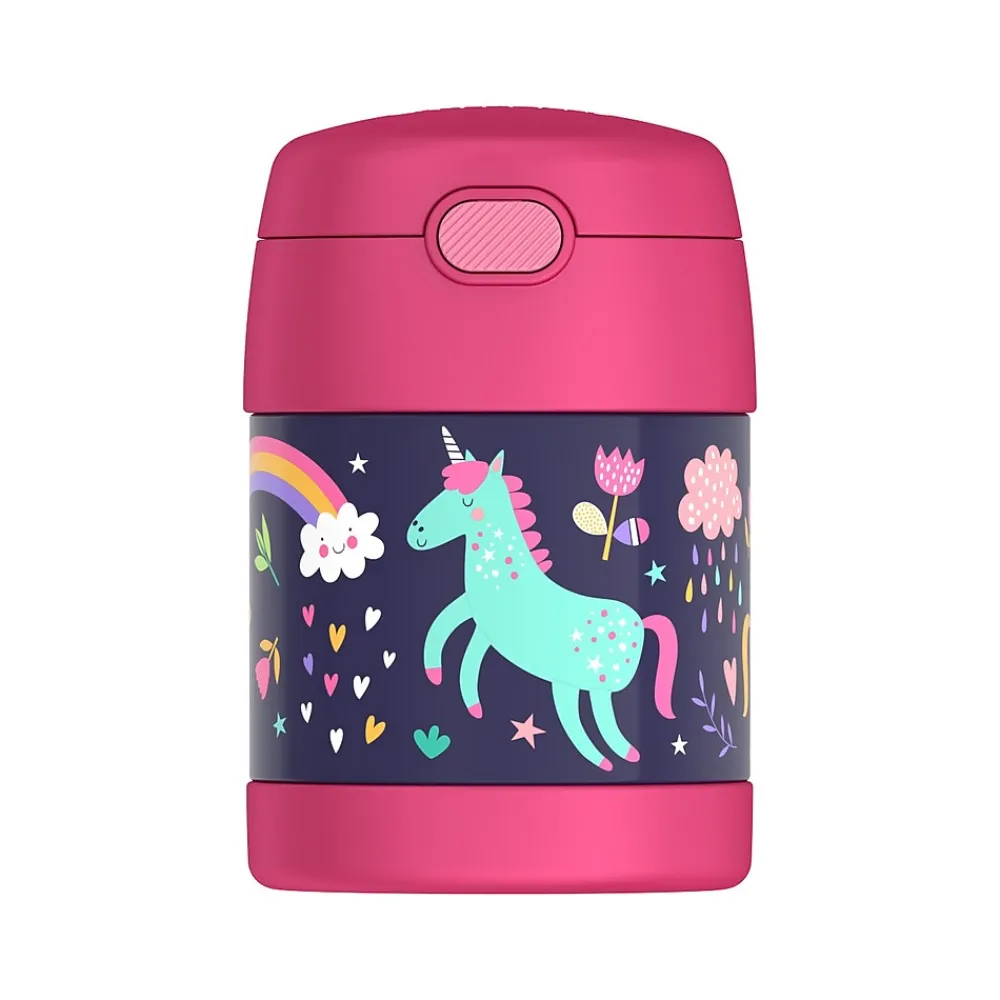 The Thermos FUNtainer 10 oz. food jar is the perfect lunch packing companion. The vacuum insulation and stainless steel construction contribute to maximum temperature retention and durability while ensuring freshness and safety of products within. The Thermos FUNtainer food jar keeps food hot for five hours and cold for seven. A folding spoon sits in the push-button lid compartment. Unscrew the entire lid to open the food compartment, which has a large opening, making it perfect to eat from as well making it easy to clean. This assortment offers a rainbow print, unicorn print, or solid pink food jars.