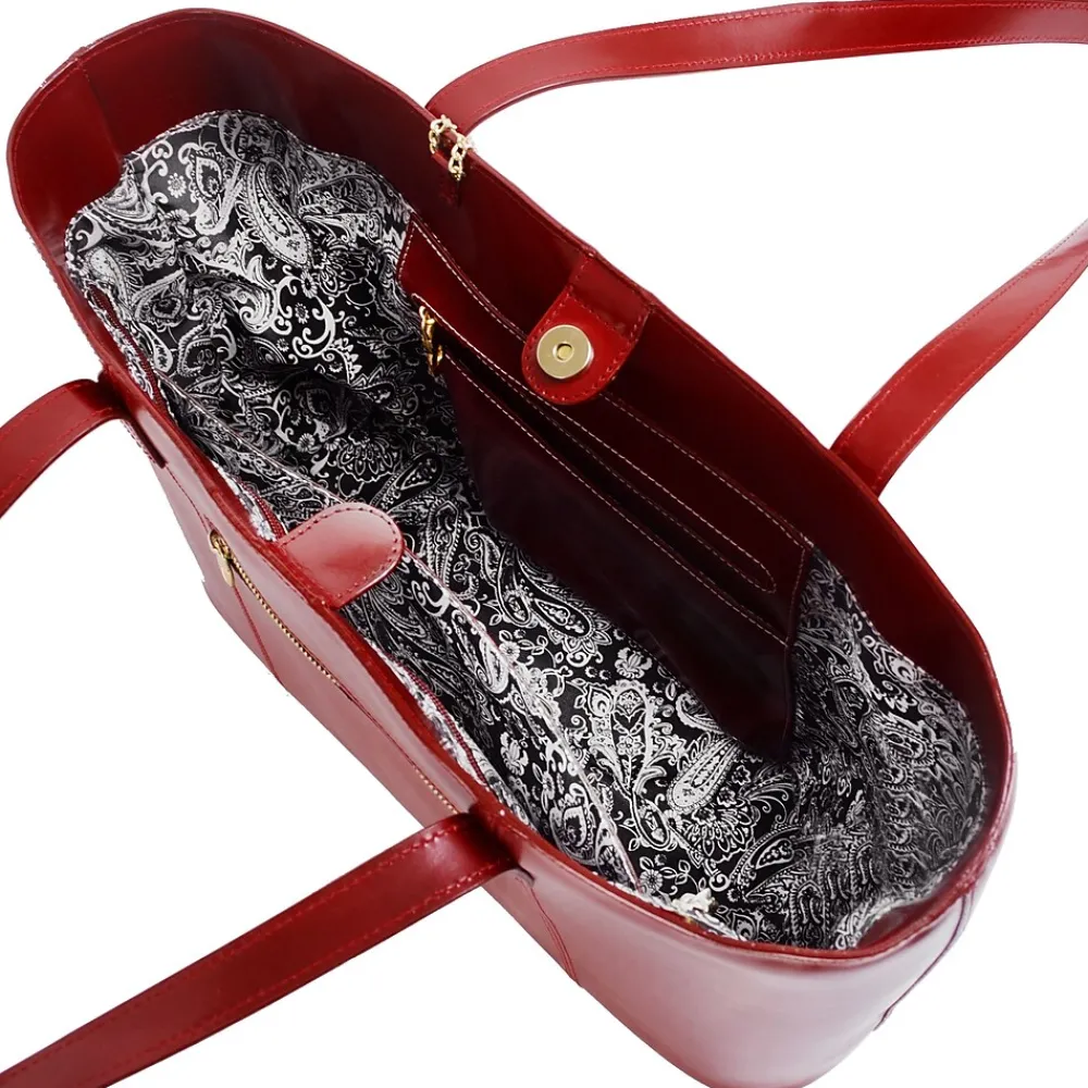 - Tote features elegant gold key chain. Easy Access Exterior back pocket. One pocket perfect for tablets. Secure zipper pocket. Two Leather reinforced accessory slip pockets.