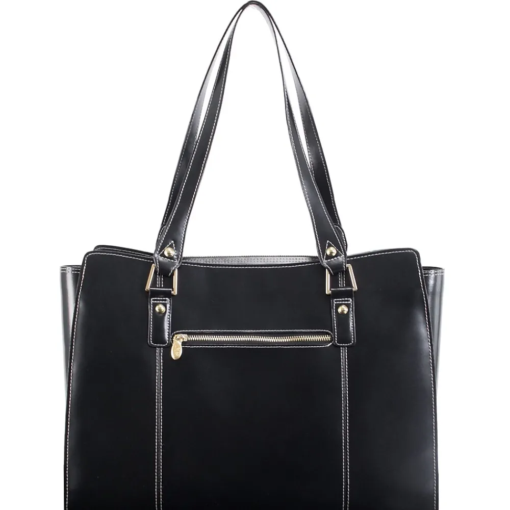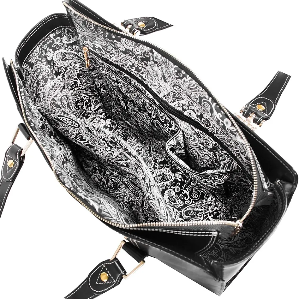 - Tote features elegant Gold Key Chain. Easy Access Exterior back pocket. One pocket perfect for tablets. Secure zipper pocket. Two Leather reinforced accessory slip pockets.