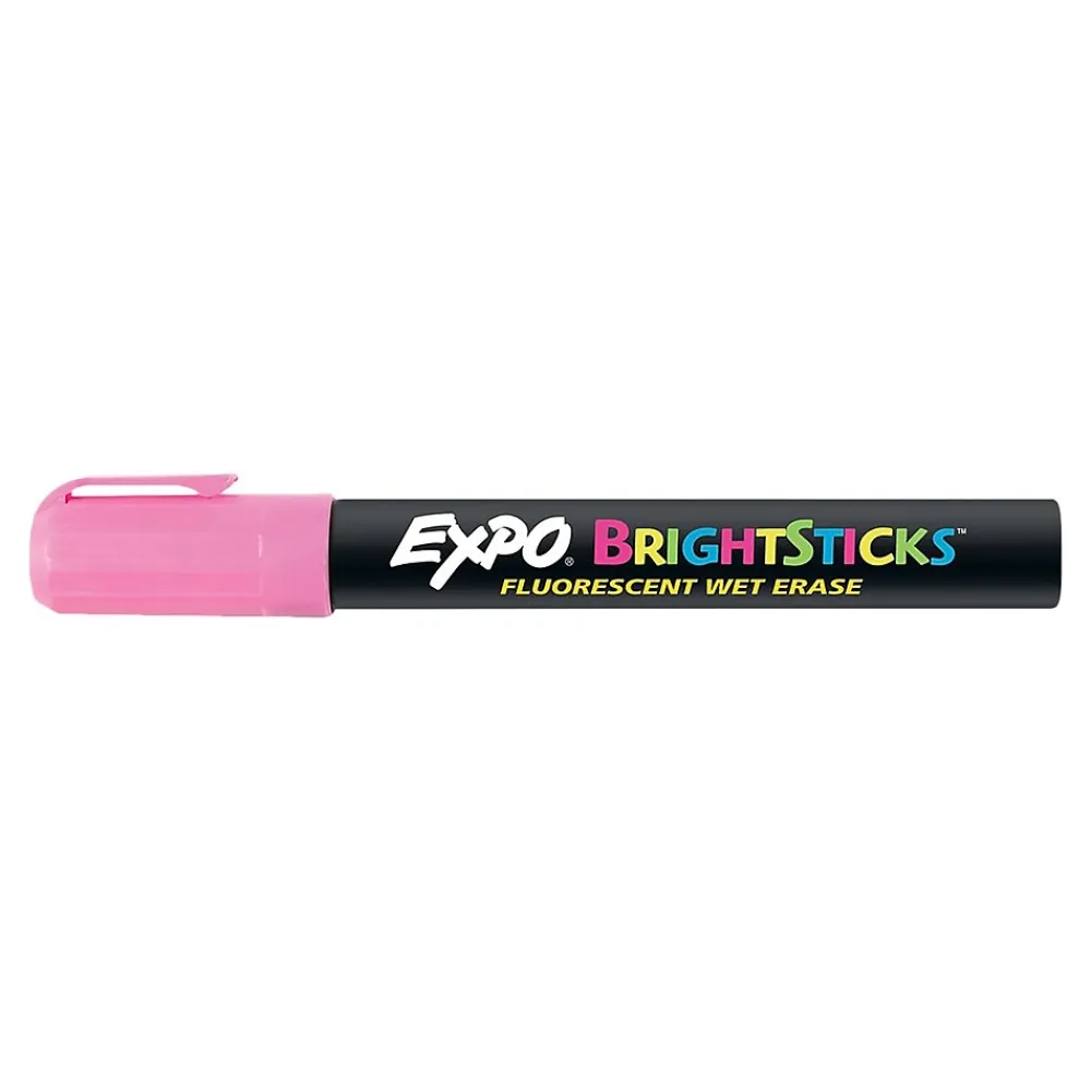 Create bright, visible text or drawings that catch people’s attention in restaurants, stores, or schools with these fluorescent wet-erase markers. These quick-drying, non-toxic markers work on glass, black marker boards, and UV-light boards, wiping right off with a wet cloth. This pack includes five assorted colors of Expo BrightSticks fluorescent wet-erase markers featuring bullet nibs for bold and uniform writing.