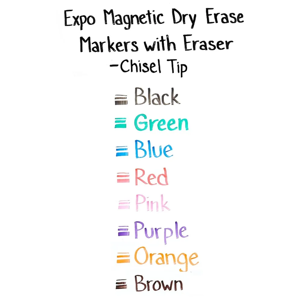 Brainstorm new concepts with your team and these Expo dry-erase markers. The bold pens come in a pack of eight assorted colors, so it’s easy to list ideas or notate diagrams clearly, and the low odor makes these markers ideal for closed areas such as classrooms and offices. Chisel tips on these quick-drying Expo dry-erase markers let you write with broad, medium and fine lines.