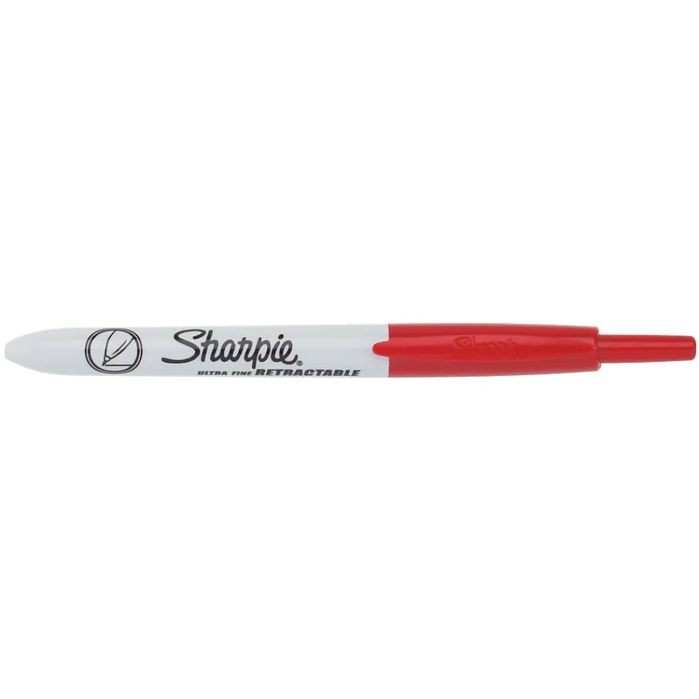 Write on almost any hard surface with these ultra-fine-point red markers. Their ultra-fine-point tips let you make permanent marks with the sharpest precision, while the quick-drying ink resists water, smearing and fading and works on glass, metal or almost any other hard surface. The permanent markers come in a pack of 12, so stocking up is simple. These Sharpie ultra-fine-point markers are retractable to prevent unwanted marking when not in use.