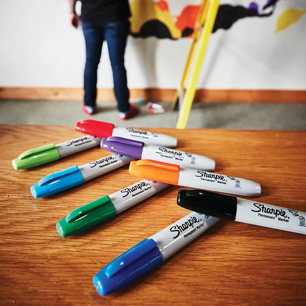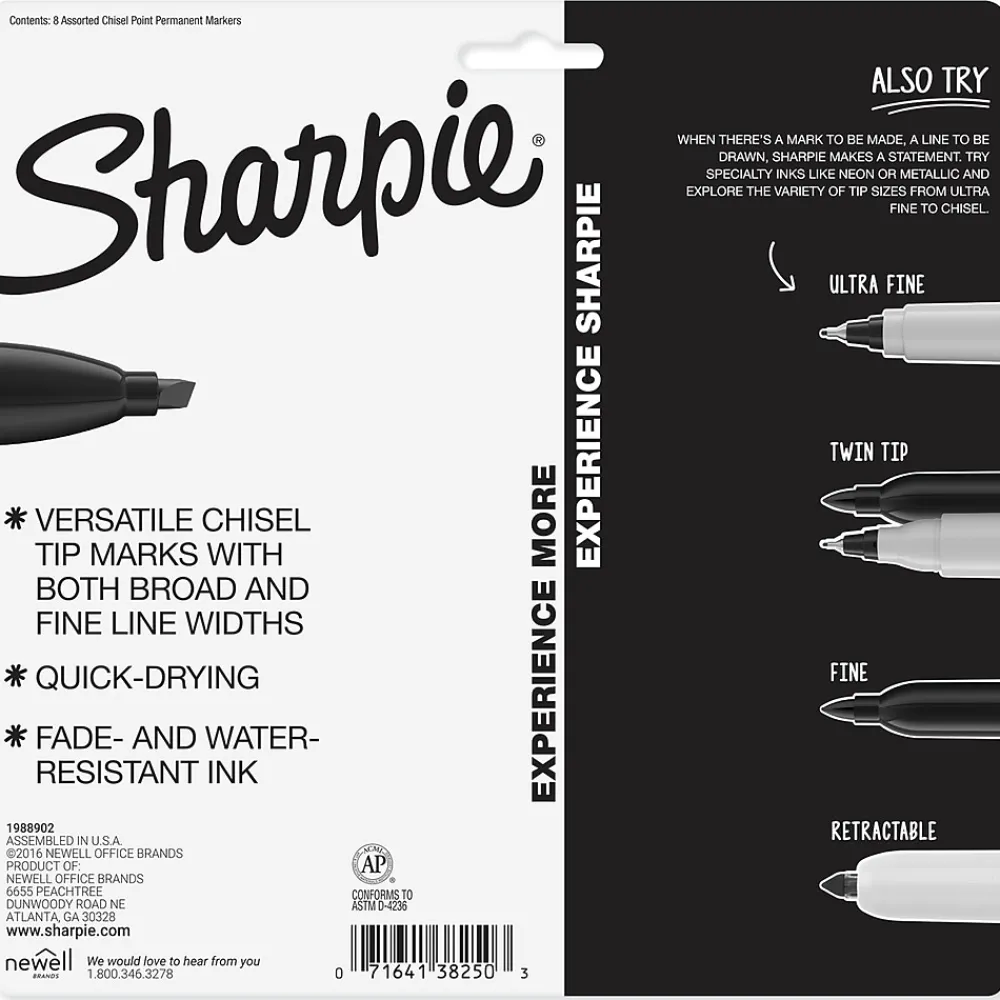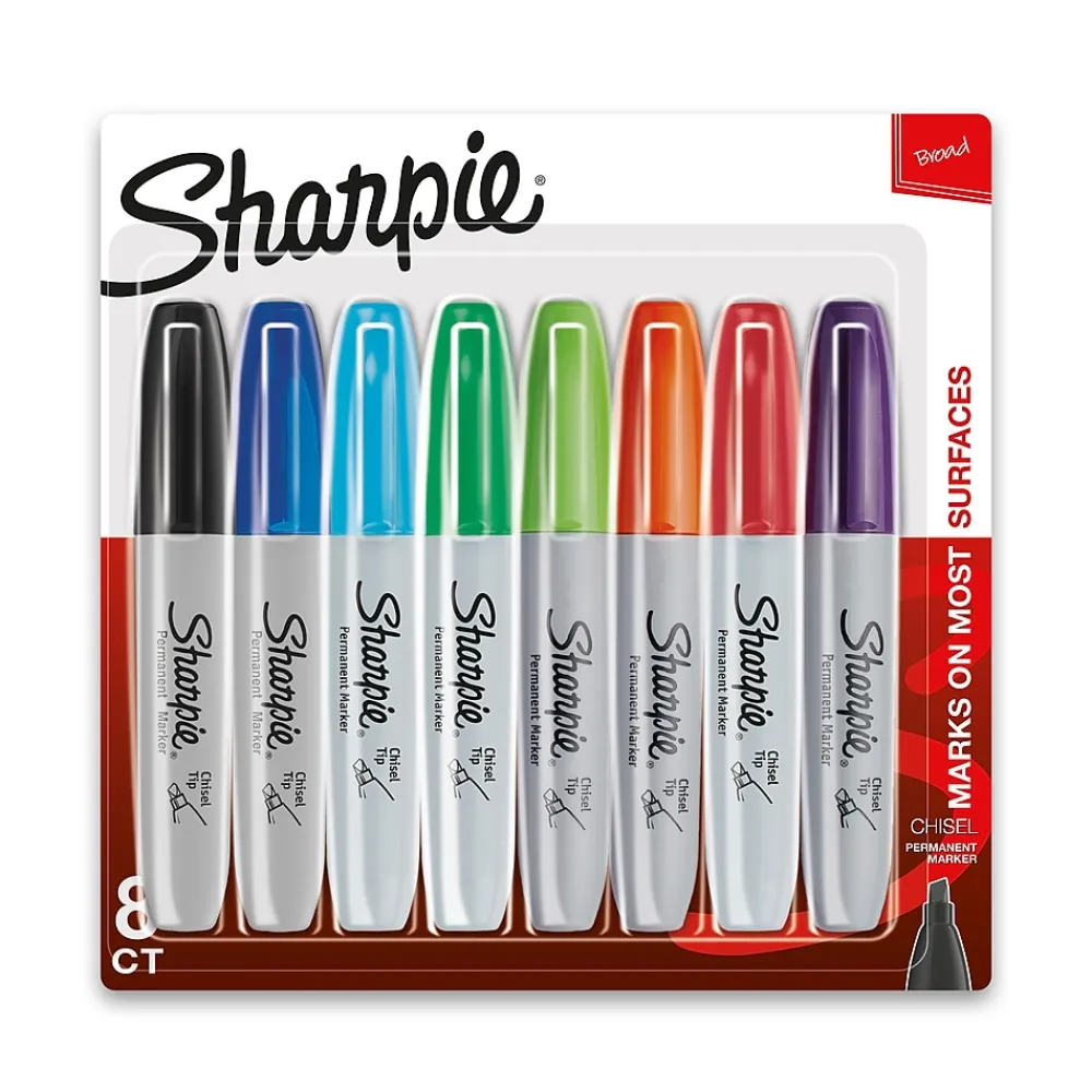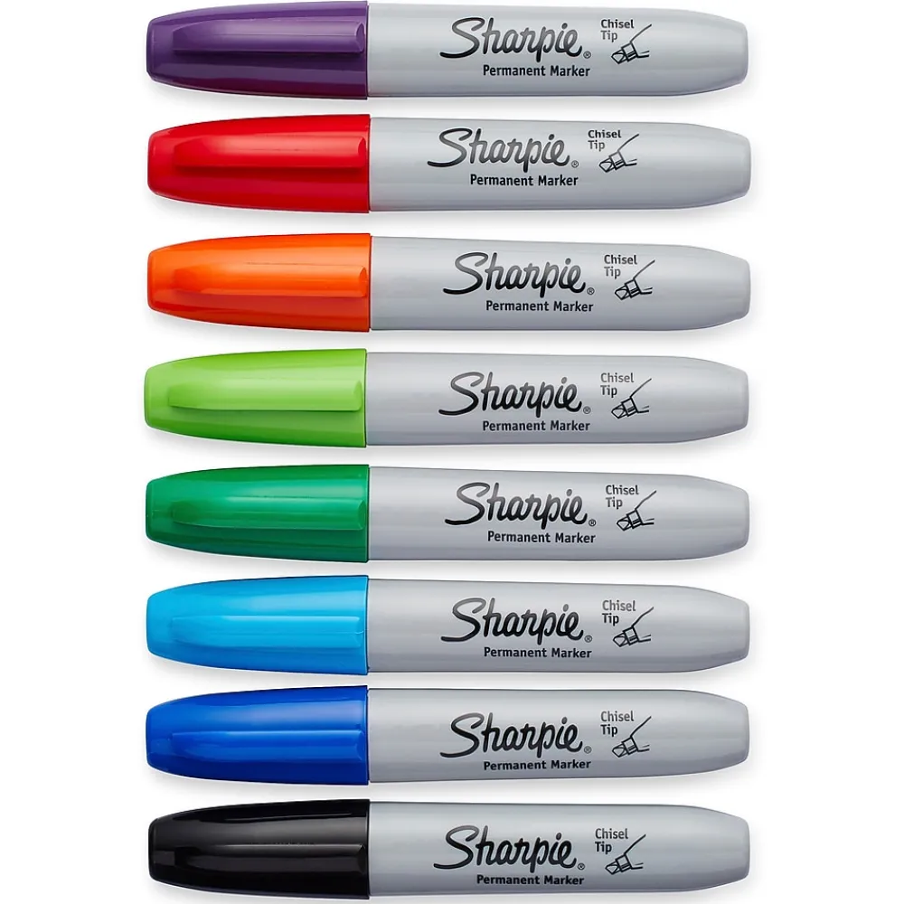 Make both wide or narrow lines with these Sharpie chisel-tip permanent markers. The permanent ink is waterproof and quick-drying to prevent your marks from wiping off or smudging, while the semi-flattened shape keeps them from rolling away. These nontoxic ink markers are safe for use in the home, classroom or office. These Sharpie chisel-tip assorted permanent markers come in eight colors for easy color-coding.