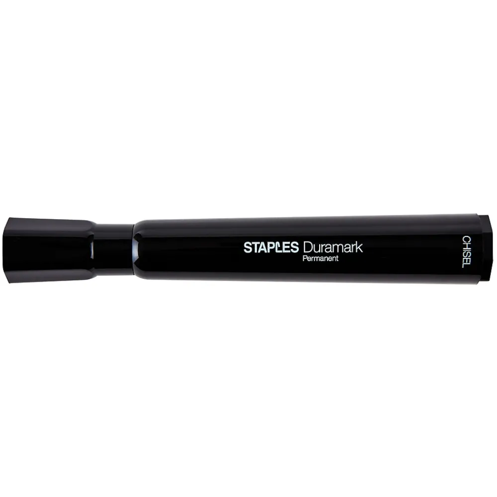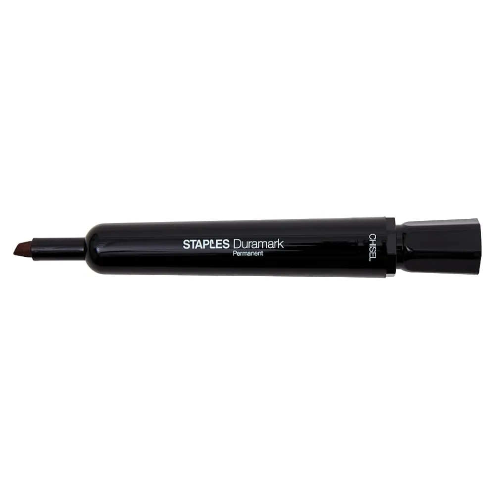 Label boxes, envelopes and kraft paper with these Staples Duramark tank markers. Chisel tips let you write in fine or broad strokes, and the large, round barrels offer a comfortable grip. The permanent ink resists fading to keep your writing looking crisp and clear over time. With 12 pieces in each pack, these Staples Duramark tank markers make it easy to stock your desk drawer or supply closet.