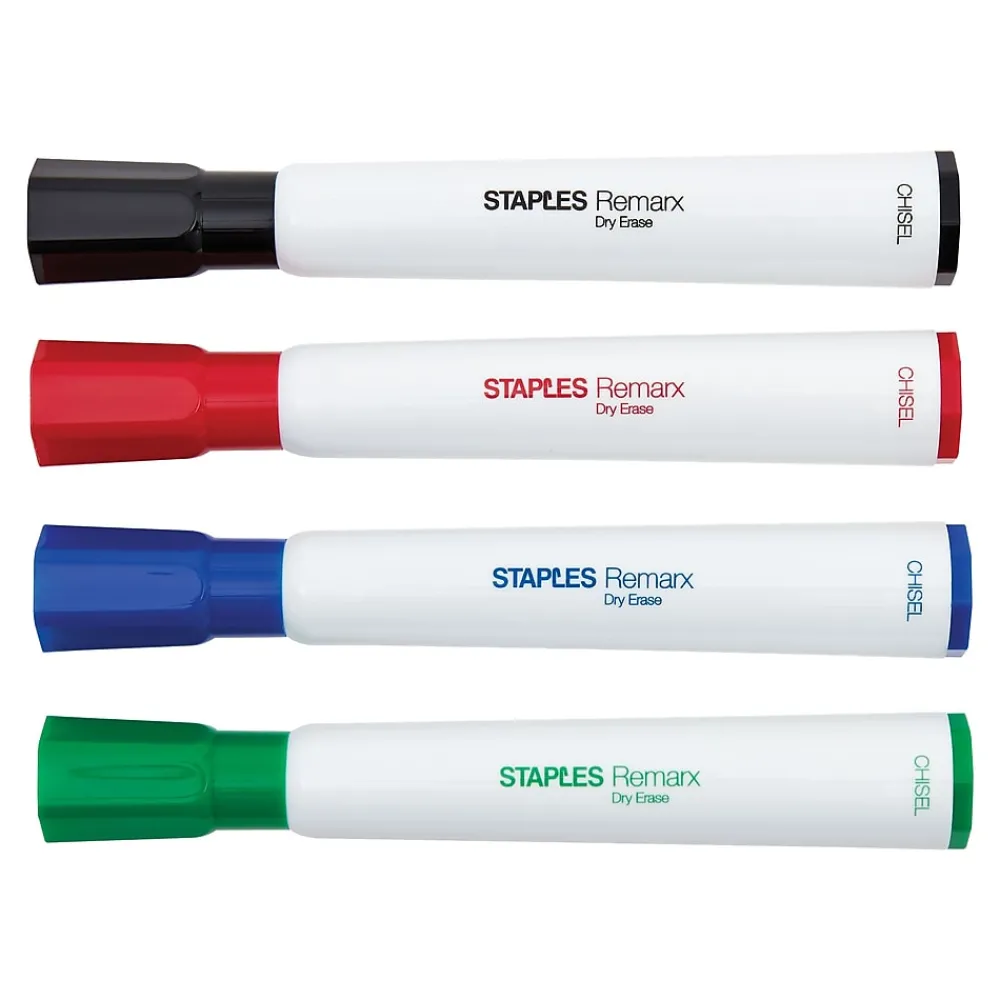 Write with bold or fine lines when you use these Staples Remarx dry-erase tank markers, which feature chisel tips. Four vibrant colors let you categorize thoughts and ideas, while the large, round barrels sit comfortably in hand as you lead team meetings or class discussions. These Staples Remarx dry-erase tank markers feature a low-odor, nontoxic formula that’s ideal for use in schools, hospitals and other professional settings.