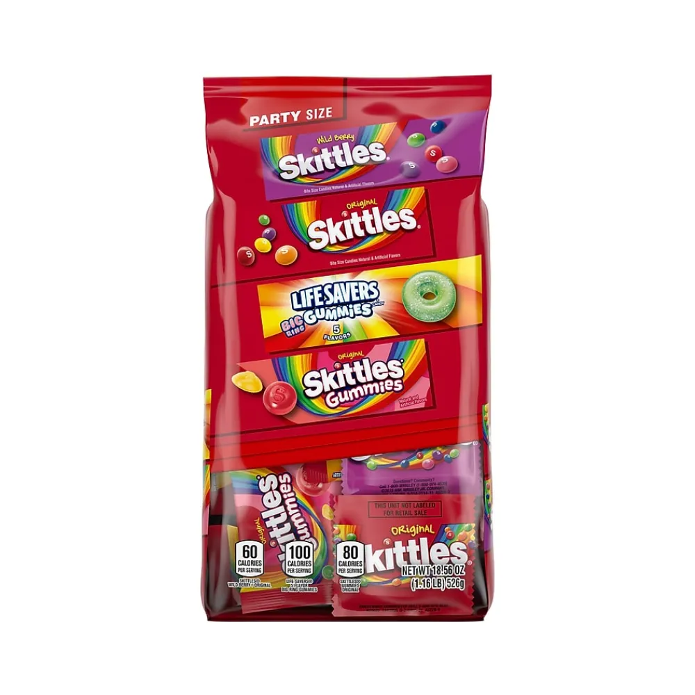 Can’t choose between chewy or gummy candy? Now you don’t have to with this Mars Skittles, Skittles Gummies, and Life Savers gummies party-size variety bag full of mouth-watering fruity candy. Stick your hand in this bulk bag of individually wrapped pieces of Skittles Original chewy candy, Skittles Wild Berry chewy candy, Skittles Gummies Original gummy candy, and Life Savers gummies. Make celebrations extra-sweet by filling your candy buffets, party favors, and pinatas with individually wrapped gummy and chewy fruit-flavored candy. Guests will be smiling ear to ear thanks to this yummy fruit-flavored assortment. Are you in charge of office snacks? Increase team morale by filling up the office candy dish with this bulk bag of candy. Eliminate those afternoon slumps and let Skittles and Life Savers turn those frowns upside down.