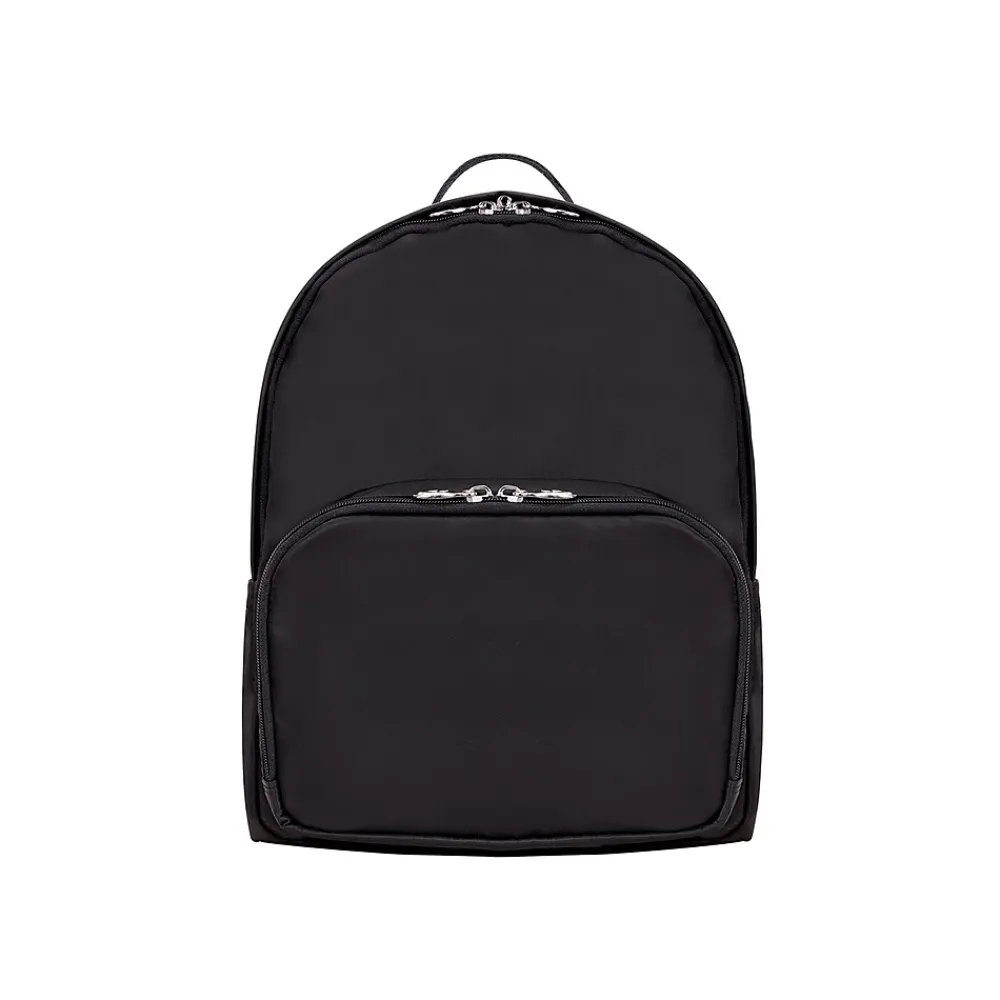 - Includes a built-in padded laptop pocket within the silver double zipper main compartment, three exterior pockets for quick access to priorities, and a double zipper pocket option for added security