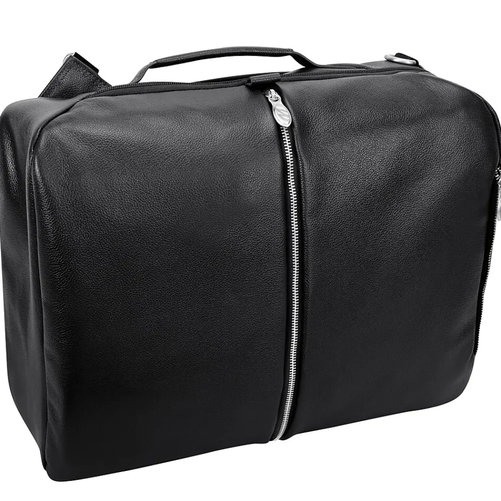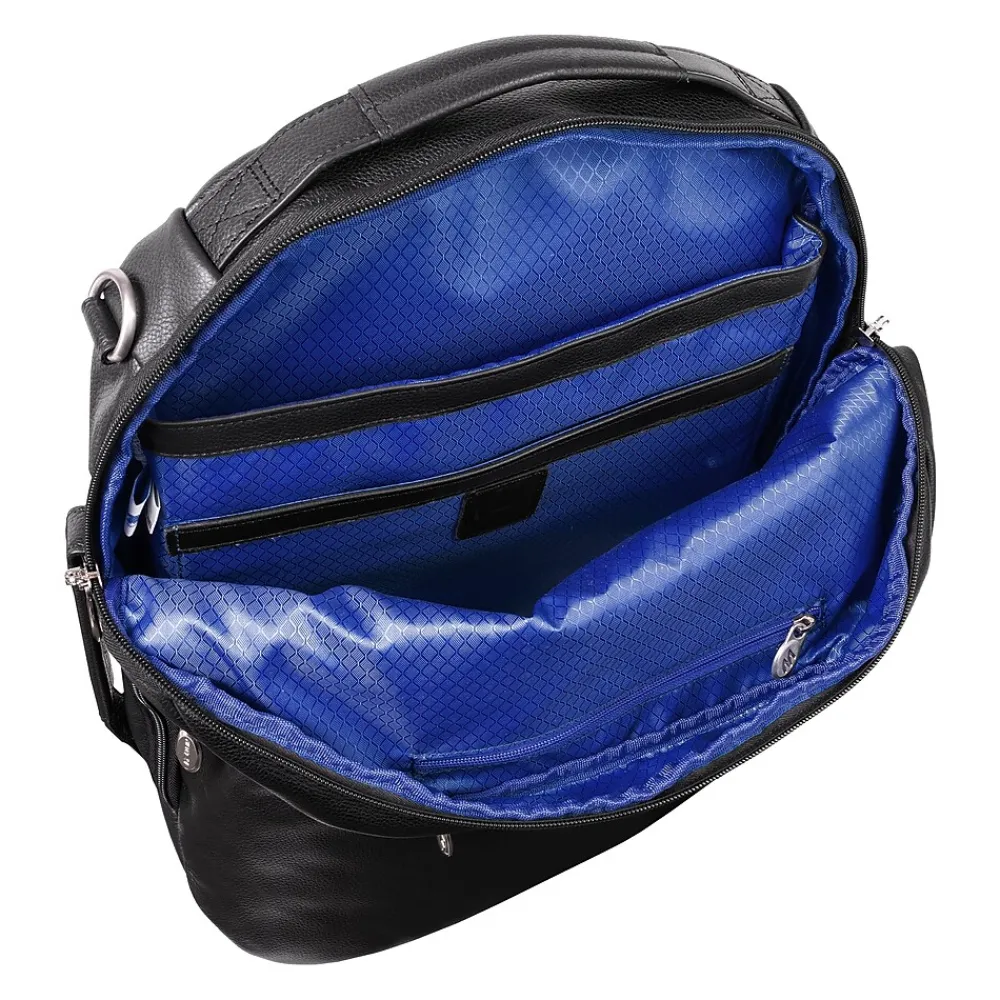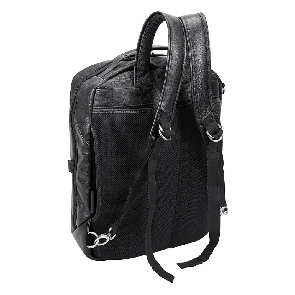 This McKlein U Series East Side versatile 18″H convertible travel backpack and messenger bag can carry you to your next trip fully prepared. Multiple options for the way you can carry your essentials with top or side carrying handle. Keep your business items easily accessible in the front horizontal zipper compartment with an interior accessory organizer. The backpack boasts a top pocket with exterior and interior access to store cellphones and keys. Safely store your important devices in the interior built-in padded 17″ laptop sleeve or the secure tablet pocket. Storage has never been easier in the fully lined interior with leather trim and silver hardware. Rear exterior features ultra-padded air mesh with air flow system (AFS) and padded backpack straps. Store it on a rolling case for easier transport with the piggyback strap. Comes with a detachable non-slip, adjustable, padded strap for shoulder carry.
