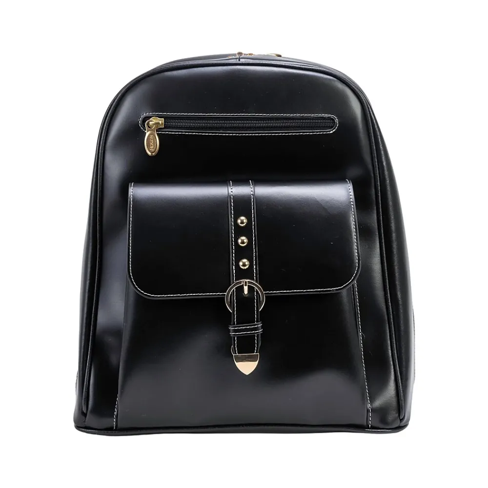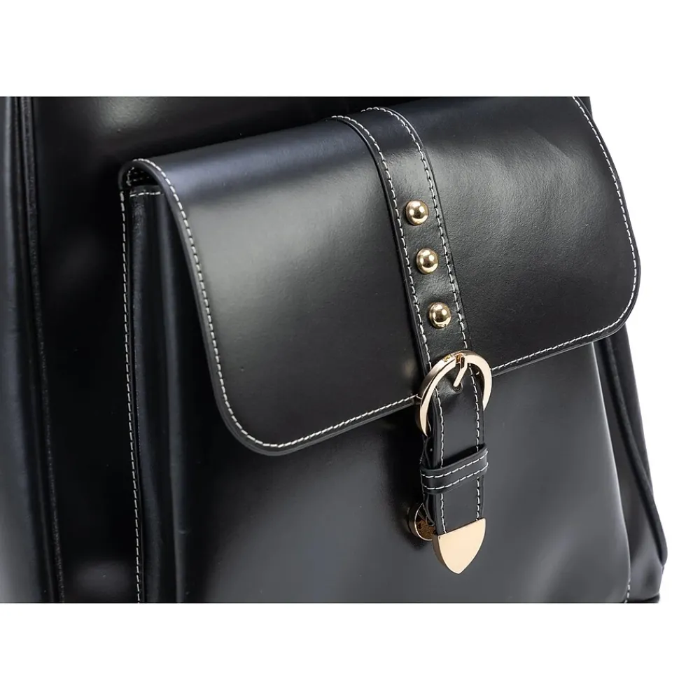 This McKleinUSA MADISON business laptop/tablet backpack features a front pocket with a magnetic clasp and a belt design on the front pocket, front zipper pocket, interior laptop pocket and tablet pocket, interior zipper pocket, four slip pockets for power cords, plugs, and accessories. The main compartment features a wide opening, with the ability to unzip all the way down on each side. The interior is fully lined, complete with hardware in a gold-tone finish. The backpack also features adjustable straps and a handle hook for carrying or hanging. Comes with protective metal feet on the base.