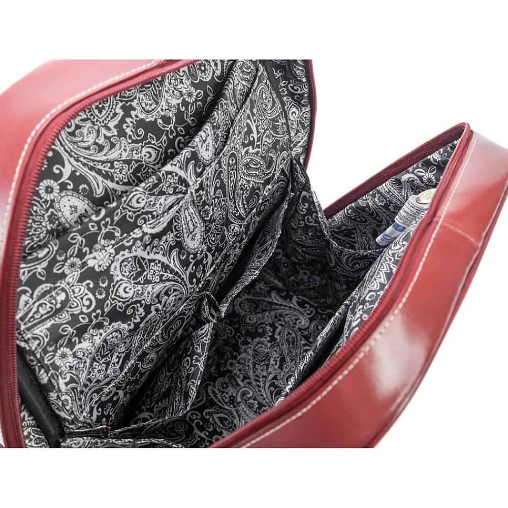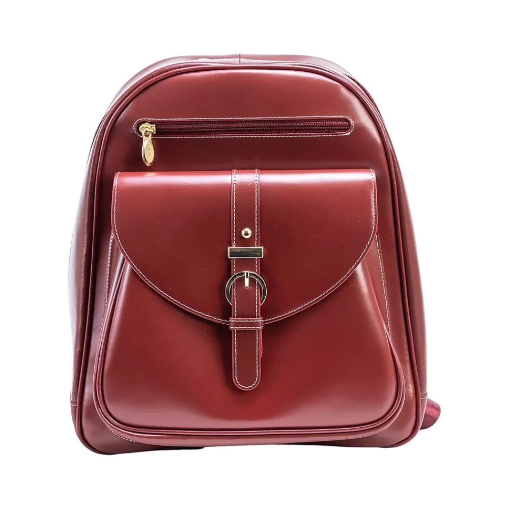 This McKleinUSA MOLINE business laptop/tablet backpack features a front pocket with a magnetic clasp and a belt design on the front pocket, interior laptop pocket and tablet pocket, back zipper pocket, four slip pockets for power cords, plugs, and accessories. The main compartment features a wide opening, with the ability to unzip all the way down on each side. The zippers on the main compartment can be locked. The interior is fully lined, complete with hardware in a gold-tone finish. The backpack also features adjustable straps and a handle hook for carrying or hanging. Comes with protective metal feet on the base.