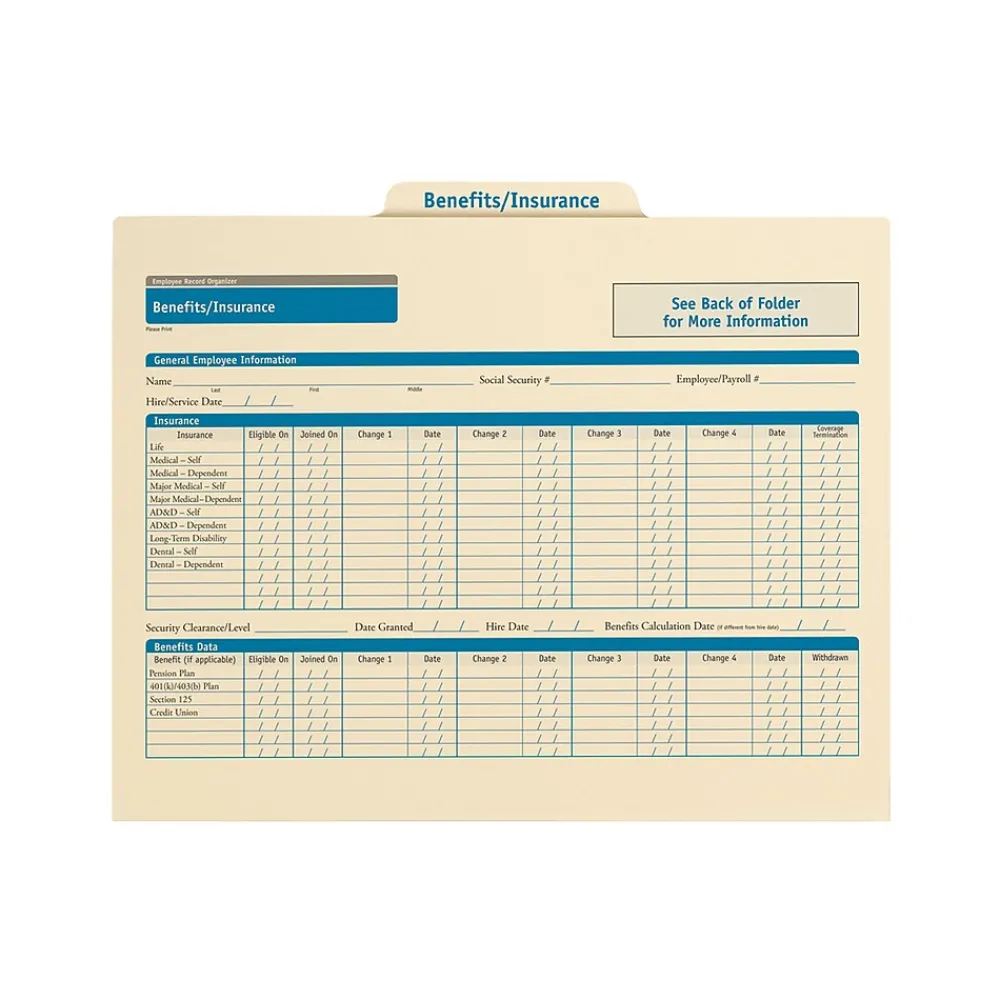 This easy-to-use record organizer covers all data from the first day to last! The ComplyRight Employee Benefits & Insurance Records Folder Organizer not only organize your paperwork – it actually helps simplify it – by capturing important personnel information right on the folder itself. Space for confidential information is concealed on the inside of the folder. This folder has passed through a comprehensive legal review to assure it complies with current employment laws, a safeguard that no other system offers.