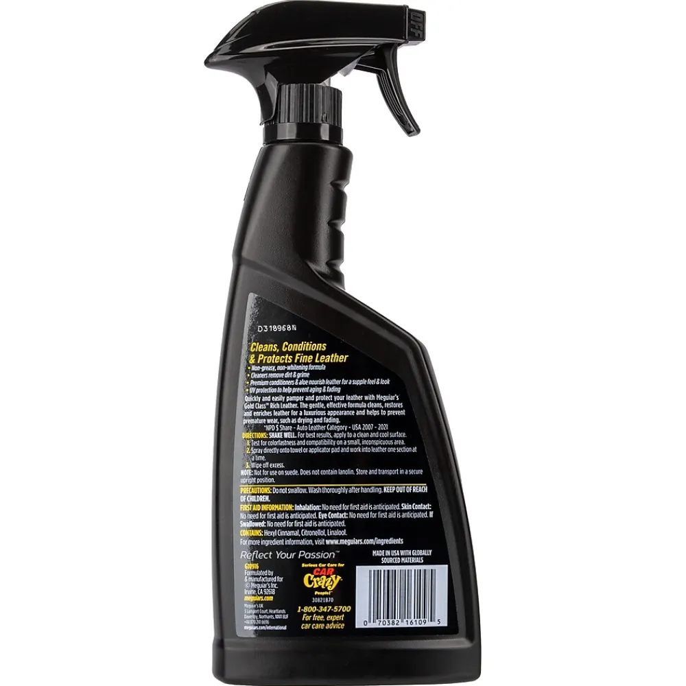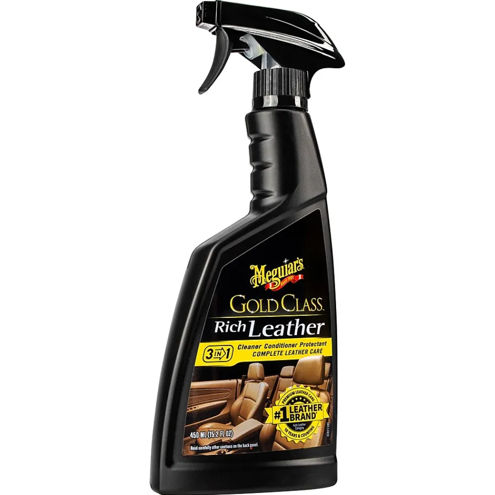 Use Meguiar’s Gold Class Rich Leather 3-in-1 formula for a simple but highly effective leather treatment that cleans, conditions and protects in one step. Our spray formula contains gentle cleaners that safely and effectively remove dirt and grime without leaving a white residue or greasy feel. Premium conditioners and aloe nourish leather for a supple look and feel, while UV protection helps to prevent aging, drying, cracking and fading. Gold Class Rich Leather 3-in-1 cleans, conditions and protects in one easy step for complete leather care.