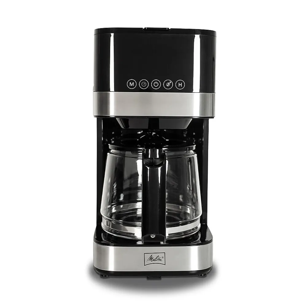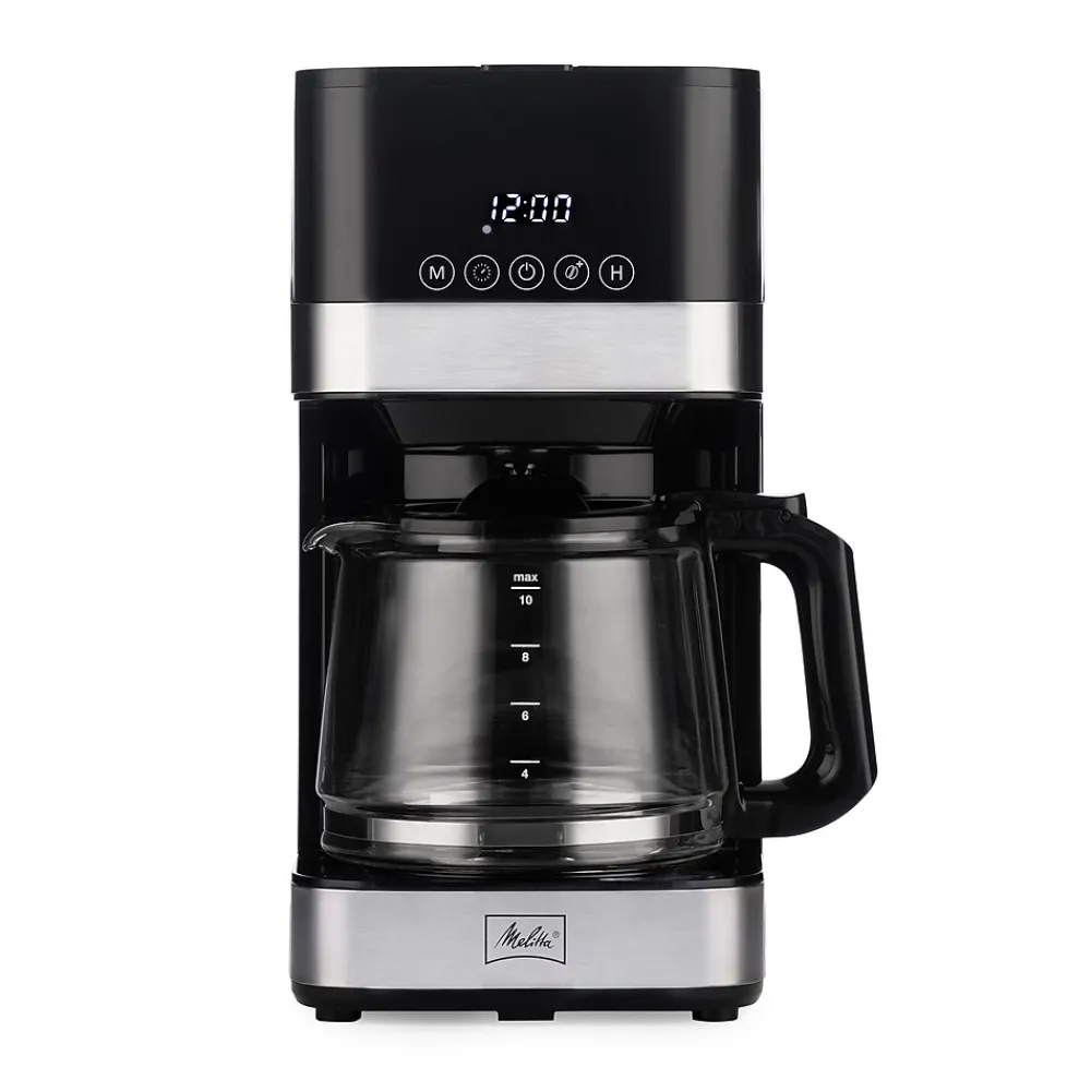 From filling the water tank to your first sip, the Melitta Aroma Tocco Drip Coffee Maker with glass carafe allows you to take in the process of brewing coffee. Space savvy in size, this stylish machine has a minimized footprint for kitchens of all sizes. Large and bright LED with Touch Control also takes into account your needs and surroundings; no physical buttons that trap kitchen dirt in gaps; it is really simple to use and easy for cleaning.