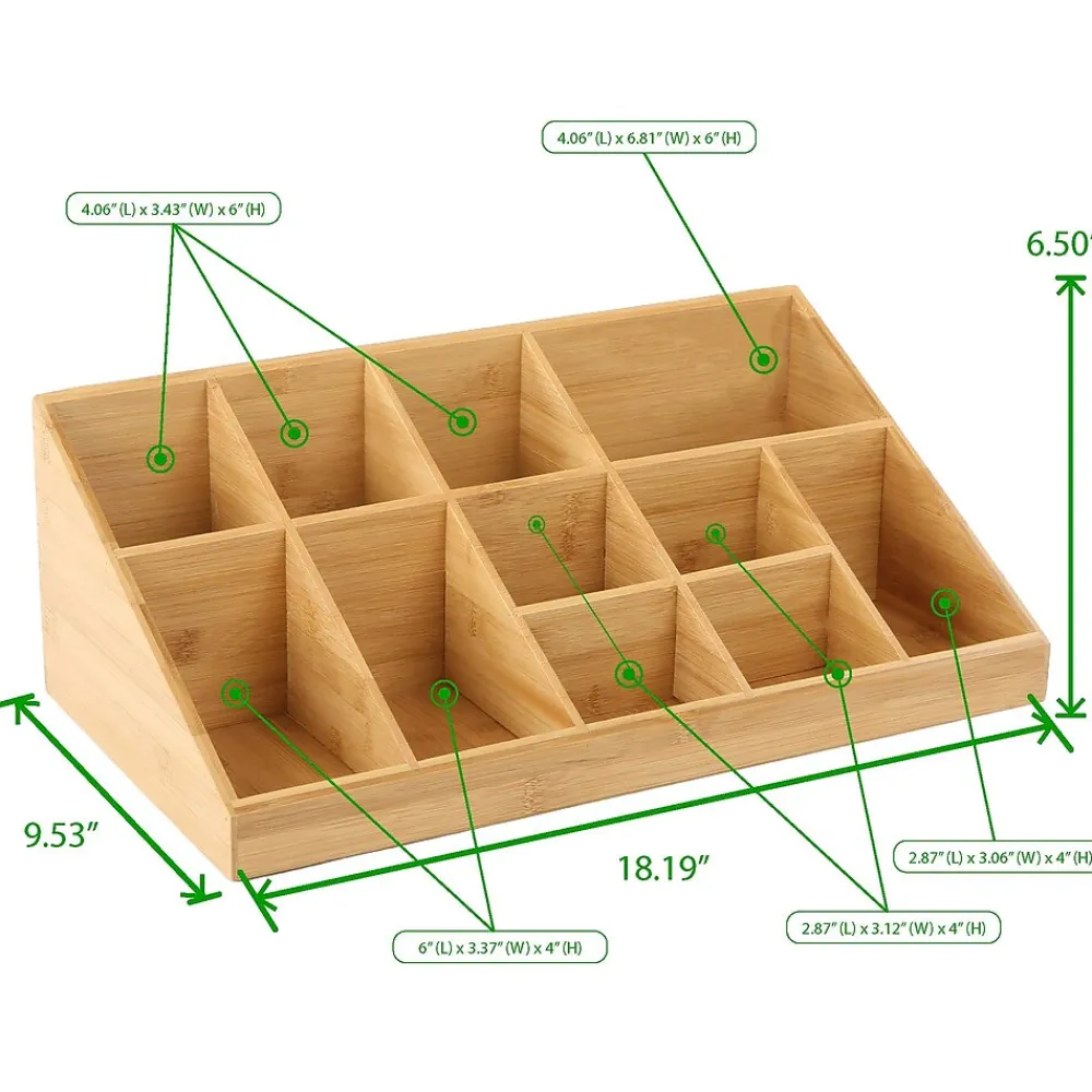 Elevate your coffee breaks with this expansive 2-tiered, 11-compartment cup and condiment organizer, revolutionizing how you access your choices. Bid farewell to rifled-through cups and unusable condiments. This station elegantly displays items, facilitating easy access and catering to diverse preferences. Versatile and ideal for hotel lobbies, breakrooms, hospitality suites, restaurants, and office receptions, it enhances various environments.Beyond cups and condiments, this adaptable organizer thrives on countertops or within cabinets, efficiently storing office supplies, art tools, and more. Varying compartment sizes simplify organizing pens, rubber bands, paintbrushes, and various items.Maintenance is simple – wipe with a damp cloth or rinse stubborn messes with warm water. Constructed from durable, eco-friendly rayon from bamboo, this organizer is ready to use immediately. Rubber grips beneath ensure stability on surfaces.Lightweight and durable, this compact organizer creates a comprehensive beverage station for office breakrooms, parties, and hospitality suites. It’s a considerate gift for those seeking enhanced coffee breaks and an organized beverage area.