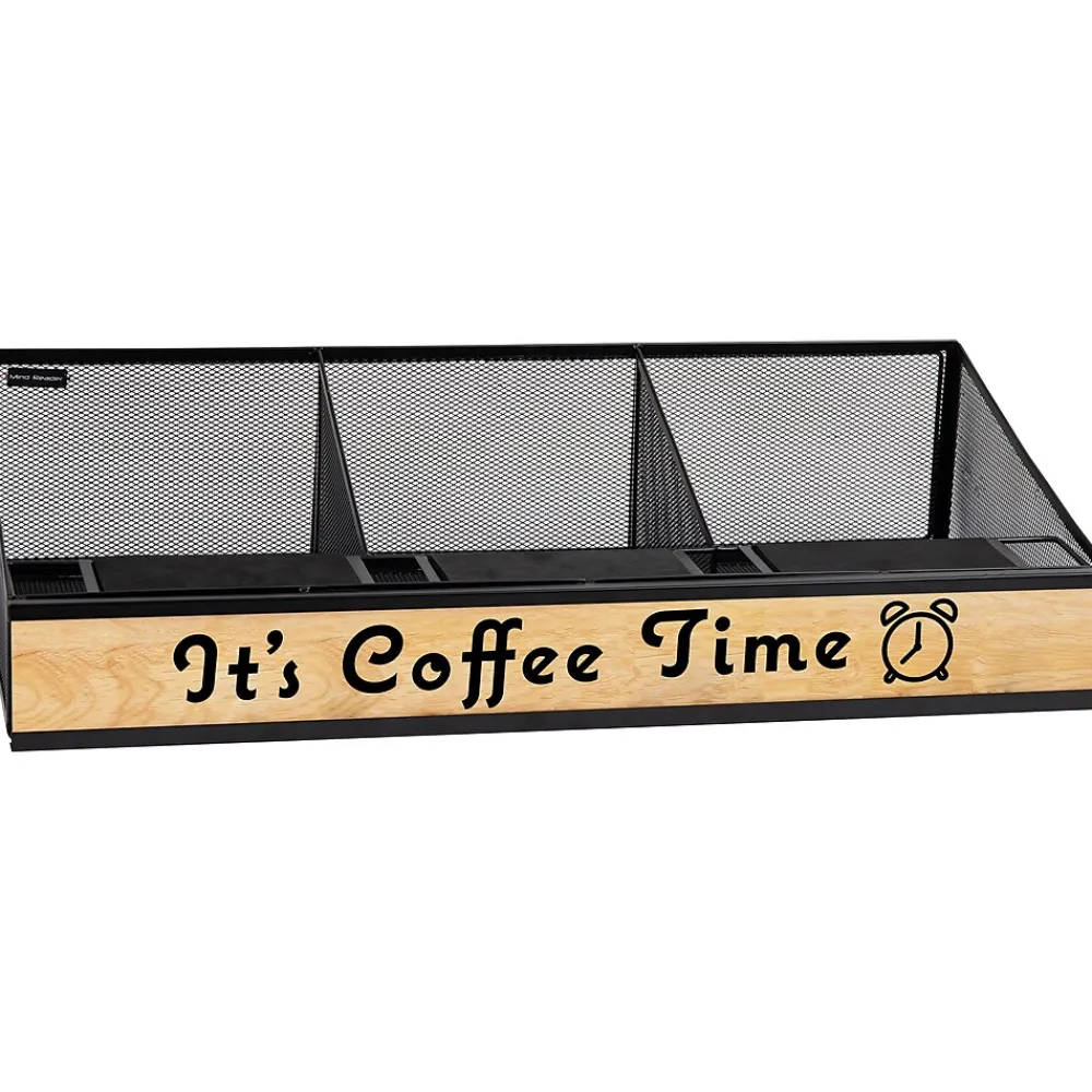 - Sleek and Seamless Design: The black wire mesh construction of this organizer effortlessly complements most kitchen or breakfast bar decor, while the “It’s Coffee Time” sign adds a friendly touch
