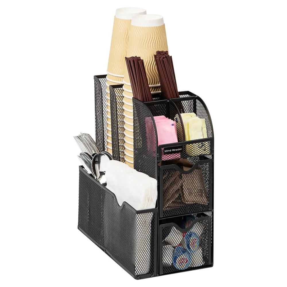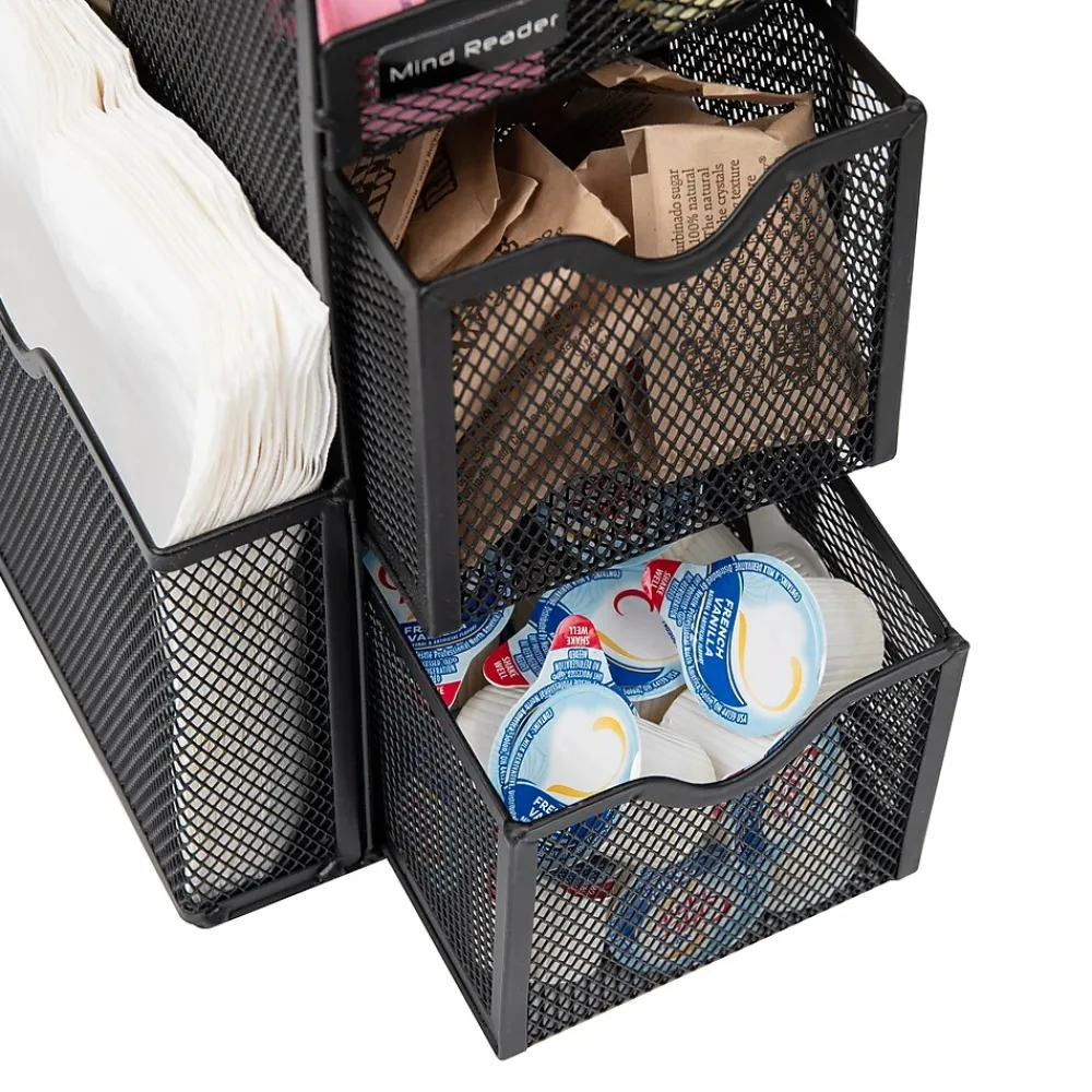 Tidy up your space with this all-in-one organizer. Boasting eleven compartments, it’s perfect for neatly storing coffee, tea, condiments, and more. The high versatility makes it an excellent choice for college dorms, office breakrooms, hotel lobbies, and even bathrooms for organizing makeup and toiletries.The 11-compartment organizer comes with three tiers and two drawers, creating an easy-to-use storage system for all your small items. Its 3.75-inch (9.5 cm) opening can comfortably stack 12-, 16-, and 20-oz cups and lids. Further compartments cater to utensils and napkins, single-serve coffee pods, creamers, tea bags, salt and pepper packets, and even snack bars and chocolates.With no assembly required, the organizer is ready to use right out of the box. Place it in your kitchen, office, or cabinets to neatly store and organize small items. It’s simple black color and modern design blend seamlessly with any decor, making it a stylish addition to any space.Constructed with durable, metal mesh, this organizer is built to withstand high-traffic areas and frequent use.Perfect for those who appreciate a neat and organized space, this 11-compartment organizer makes an excellent gift. Bring order to your spaces with this versatile, all-in-one organizer.