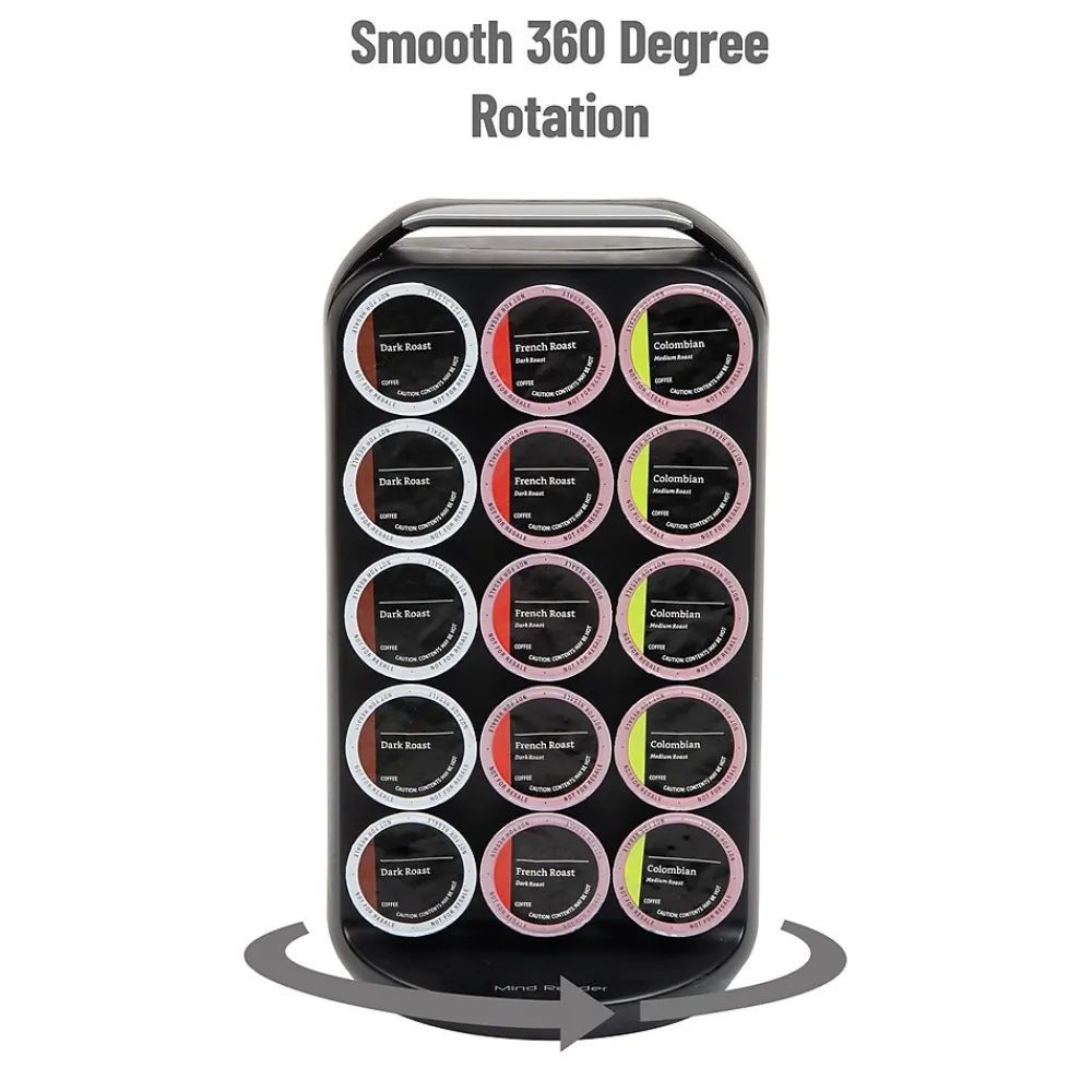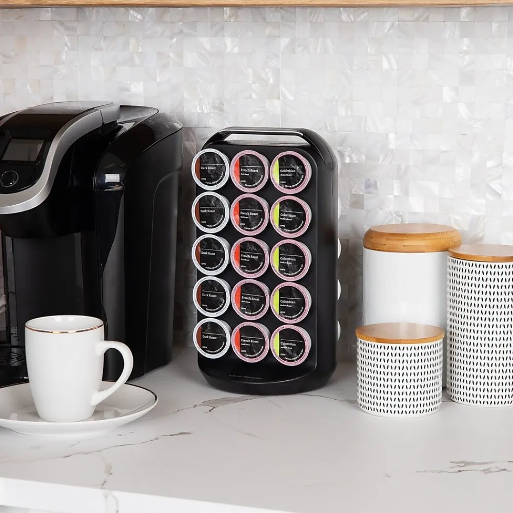 Simplify your mornings and enjoy a seamless coffee routine with this single-serve coffee pod carousel. The swivel organizer, equipped with a lower base finger grip, allows effortless browsing through 30 coffee choices with a simple wrist movement.Featuring a patent-pending locking system, this countertop coffee pod storage ensures secure pod placement at any angle. Compatible with 1.5-inch (3.81 cm) base and 2-inch (5.08 cm) top single-serve pods, inserting and retrieving coffee pods becomes exceptionally convenient.Crafted from lightweight, durable black plastic, the carousel is easily cleaned with a damp cloth, ensuring a smooth swivel base. Rubber grips beneath provide stability and prevent slipping on countertops.Transporting is easy with the built-in handle, and its compact design takes minimal countertop space, making it an excellent kitchen or office addition.Gift this coffee pod carousel to early risers, teachers, grandparents, or anyone valuing a swift and organized coffee experience. Elevate their mornings with this considerate and practical organizer.