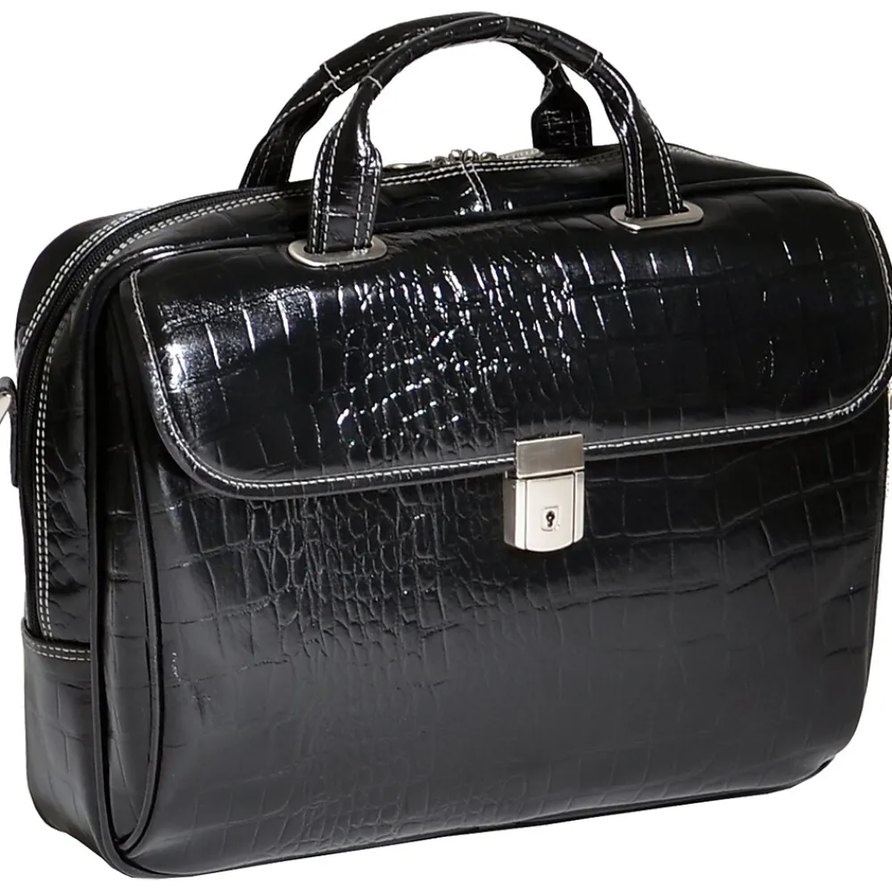 Briefcase features quick, accessible front pocket with clasp and two small accessory pockets.