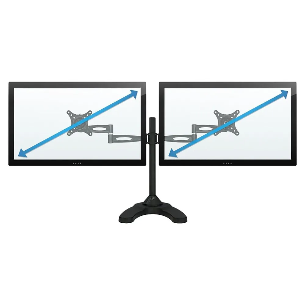 - FULLY ADJUSTABLE: Two monitor mount arms can tilt up and down 15 degrees, swivel left-right 360 degrees, raise and lower 17″ inches on the pole, and each screen can be rotated and placed in portrait or landscape orientation independent of one another.