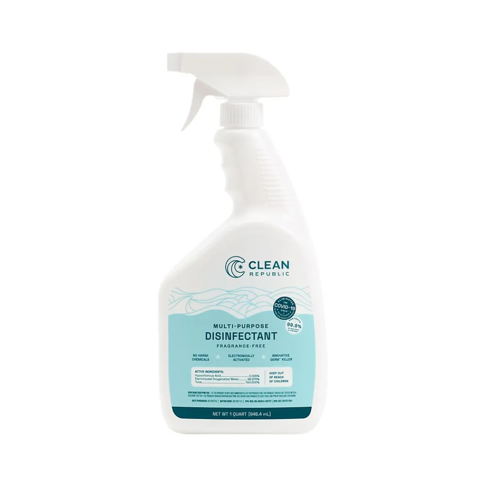 The Clean Republic multipurpose disinfectant is formulated with hypochlorous acid (HOCl) using three simple ingredients: salt, water, and electricity. This disinfectant has no harsh chemical smell and is great for use at home or at the workplace. It is one of the most effective antimicrobial agents available, rivaling bleach, peroxides, and quaternary ammonium compounds.