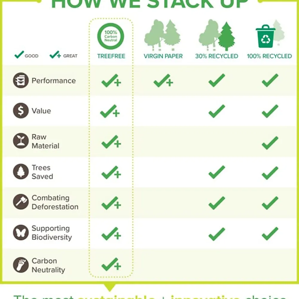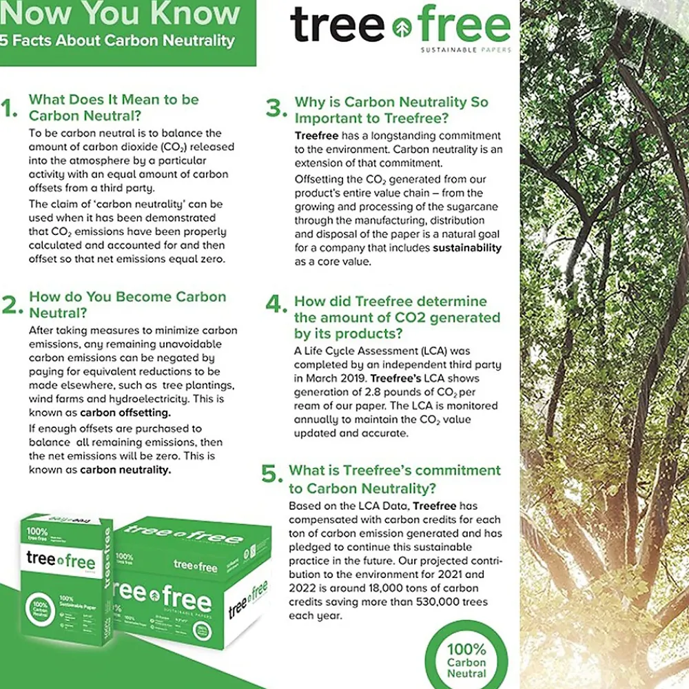 Make a positive impact on the environment now and for future generations with TreeFree’s 100% tree free, carbon neutral multipurpose paper. TreeFree multipurpose paper is made from 100% sugarcane waste fiber and any carbon emissions from manufacturing TreeFree paper are offset through partnerships with world-renown organizations such as wildlife Works whose projects protect threatened forests, wildlife and communities.