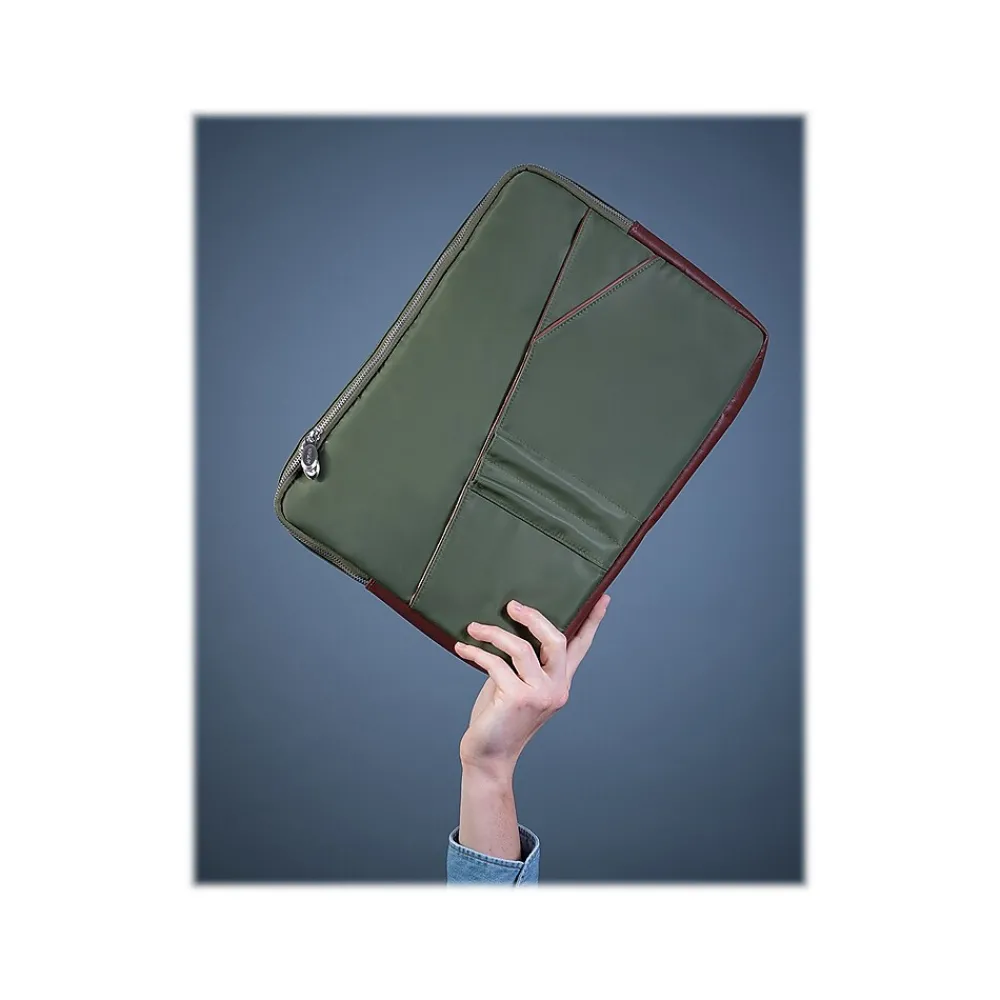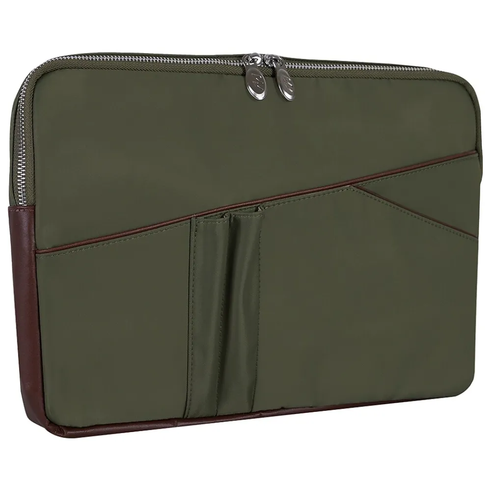 This padded nylon laptop sleeve with leather accents has a fully lined interior. It also features an easy-access front organizer for pens and accessories and a back full-length file pocket.