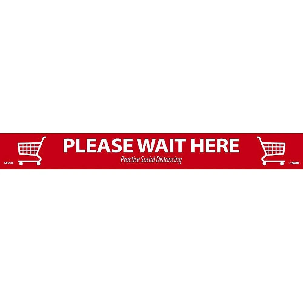 - Floor sign with the “Please Wait Here. Practice social distancing” message