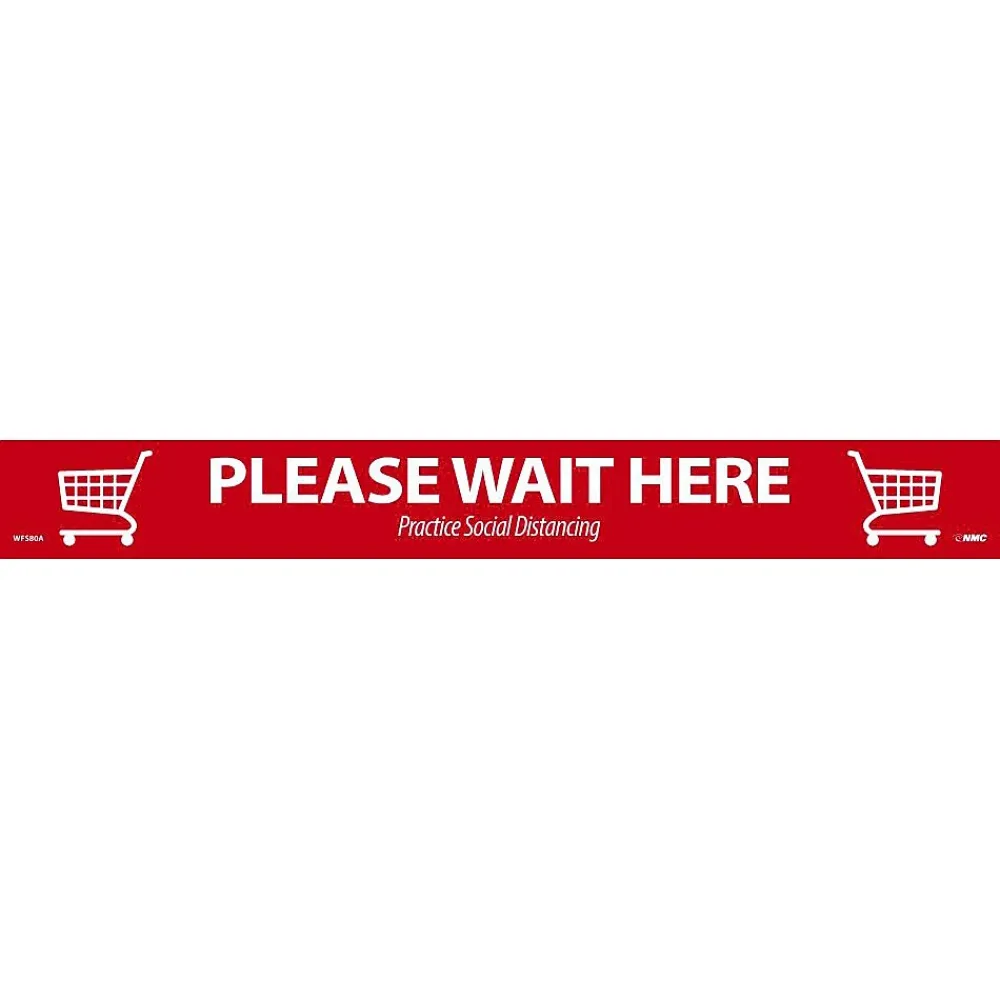- Floor sign with “Please Wait Here. Practice social distancing” message imprinted in English