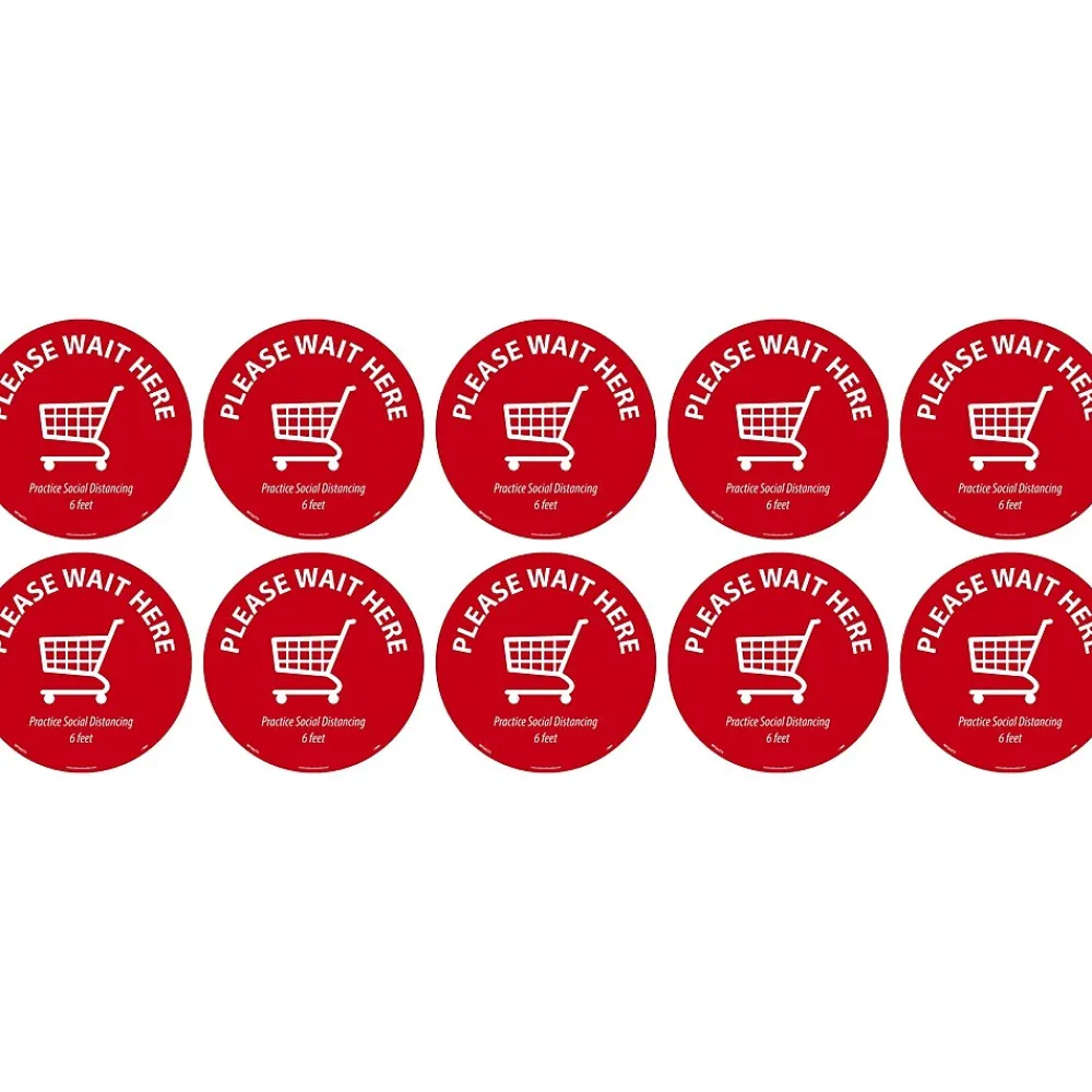 - Floor sign with the “Please Wait Here. Practice Social Distancing 6 feet” message imprinted in English
