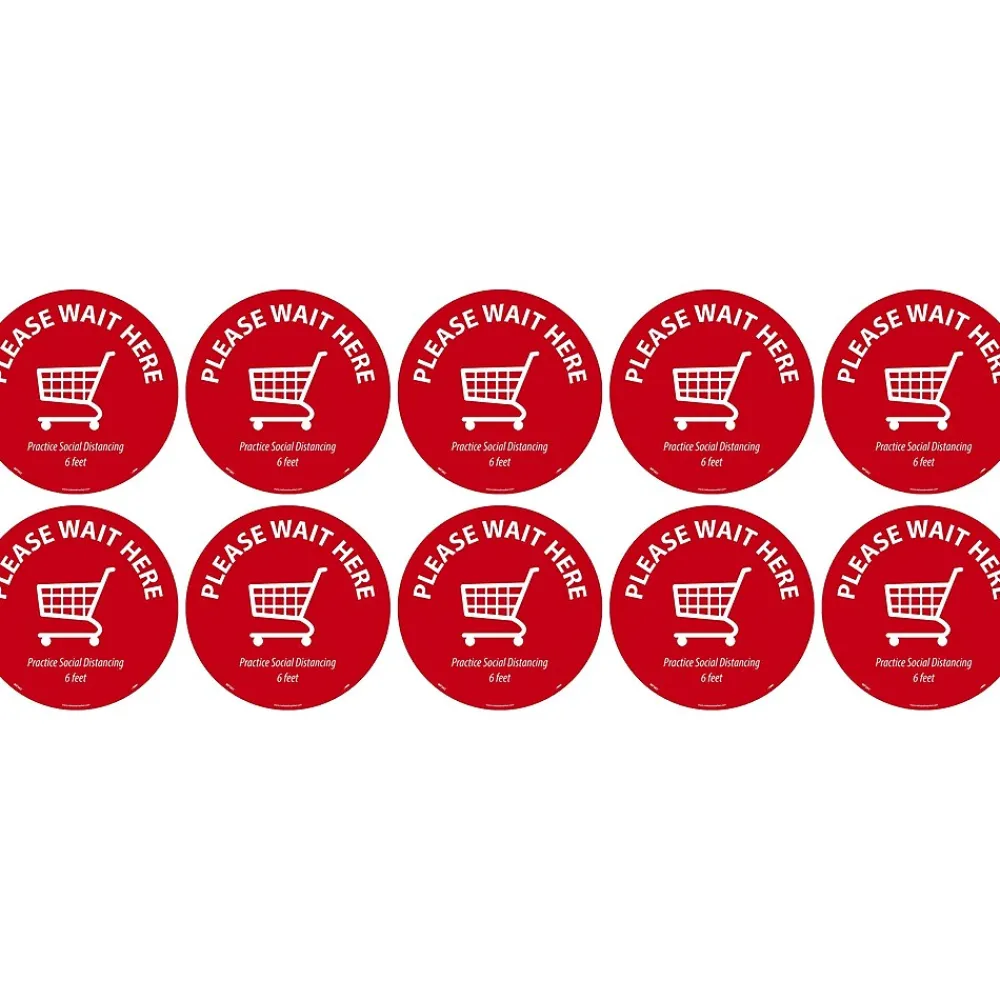 - Floor sign with the “Please Wait Here. Practice Social Distancing 6 Feet” message imprinted in English