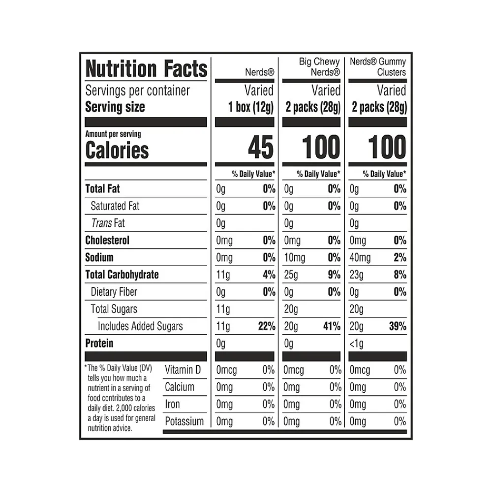 - Assortment includes: Nerds Gummy Clusters, Big Chewy Nerds, and Classic Nerds