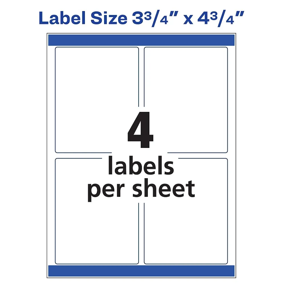 - 4 labels per sheet, 25 sheets per pack; 100 total labels