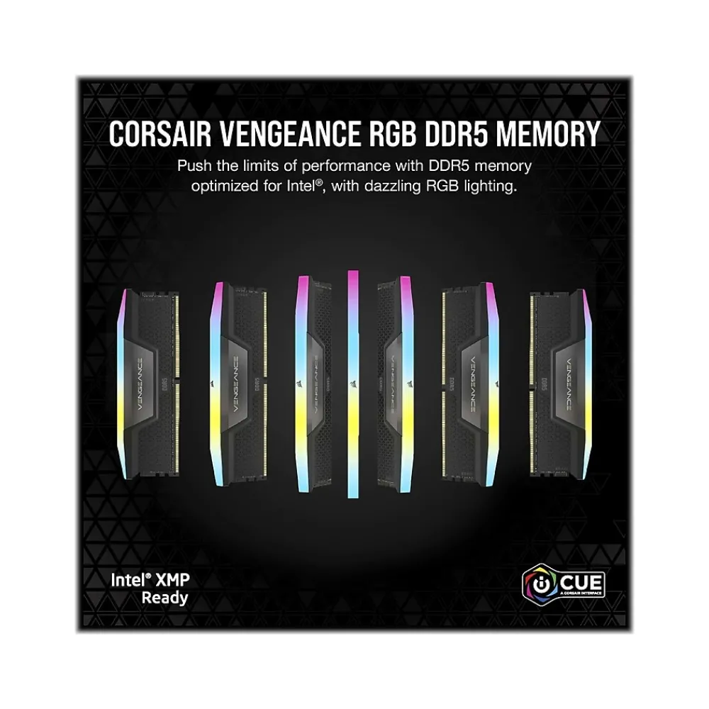 The Corsair VENGEANCE RGB DDR5 memory kit delivers DDR5 performance, higher frequencies, and greater capacities optimized for Intel motherboards while lighting up your PC with dynamic, individually addressable ten-zone RGB lighting. In the multicore era, the unprecedented processing speed of DDR5 DRAM ensures your high-end CPU gets data quickly with ease. Whether you are gaming, creating content, opening 100 tabs, or multitasking, your gaming PC can power through complex tasks faster than ever before.