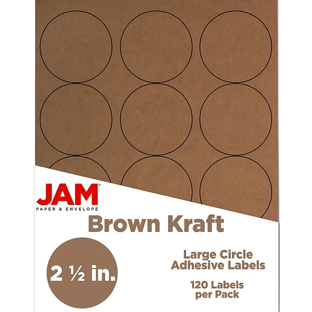 JAM PaperĀ® 2 1/2″ Circled brown Kraft label makes easy to identify personal belongings, envelopes, books or other items. Label has overall dimension of 2.5″ x 2.5″.
