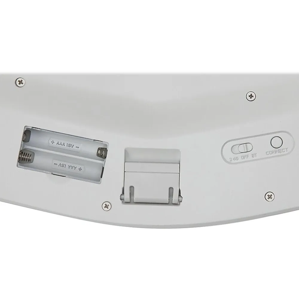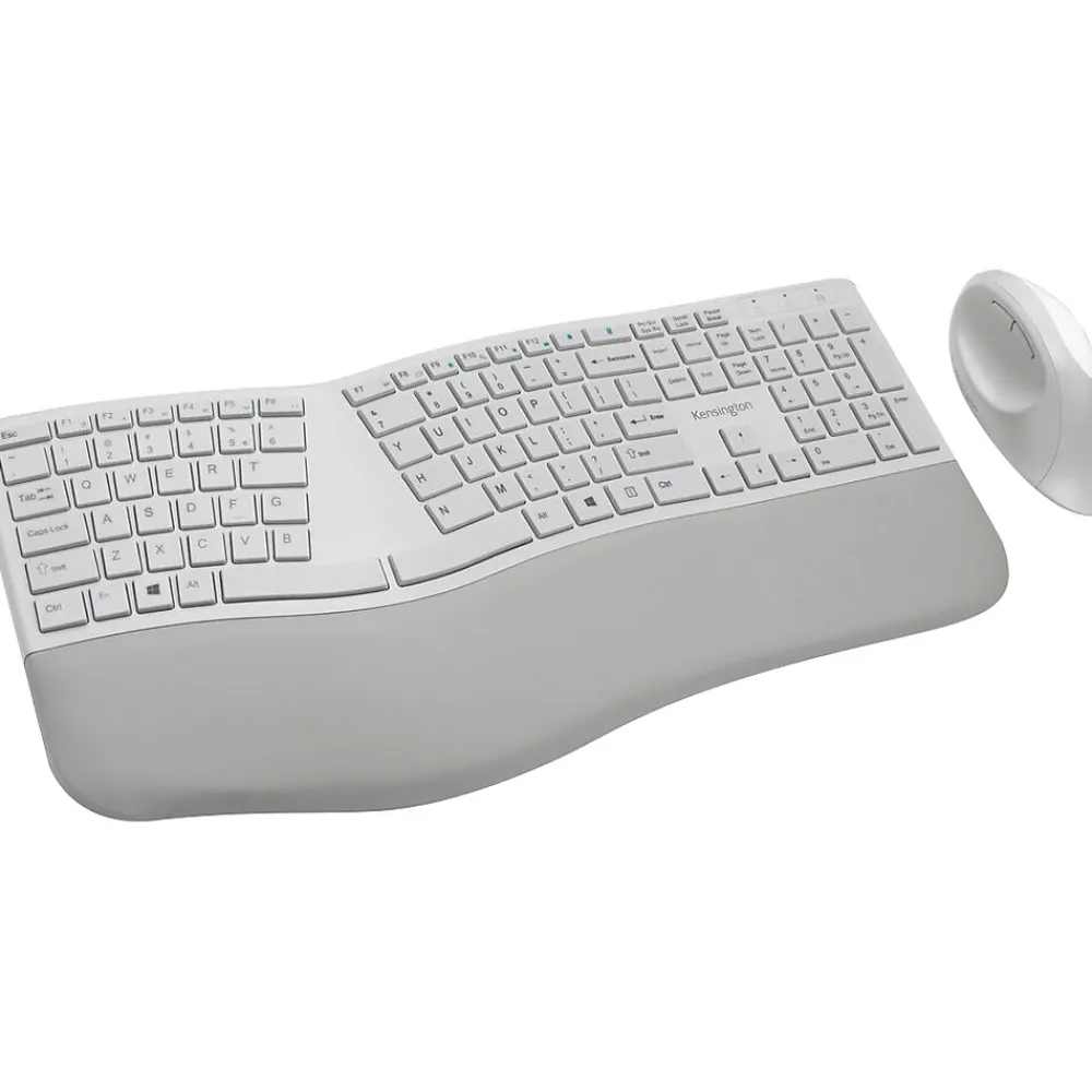 The Kensington Pro Fit Ergo split and sloped keyboard comes with adjustable reverse tilt, built-in wrist support, and neutral grip. The ergonomist-approved wireless keyboard and mouse position your hands for improved comfort. The features include dual wireless connectivity (2.4GHz and Bluetooth 4.0 LE) with 128-bit AES encryption security; quiet typing and clicking; spill-proof keys; F-keys for shortcuts; caps lock, number lock, and scroll lock; low battery indicator lights; a five-button (including forward and back) mouse; three-mode power-saving switches; and a replaceable receiver. In the event the receiver is lost or damaged, simply purchase a new one, pair it with your mouse, and you’re all set.