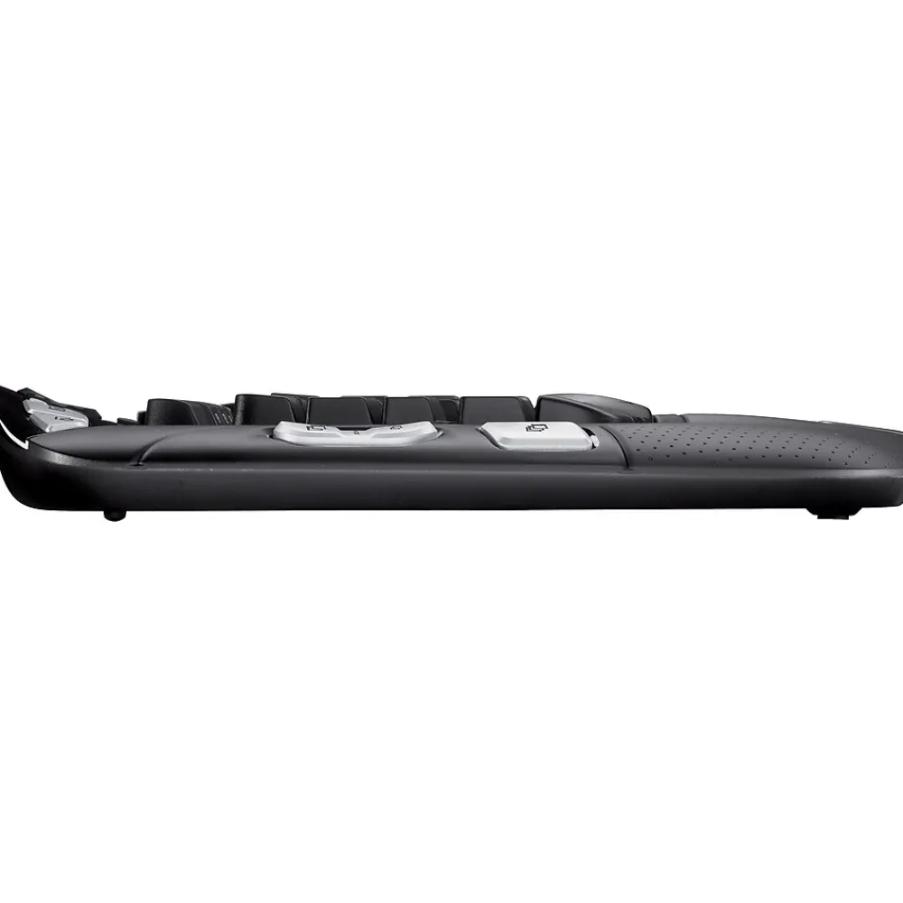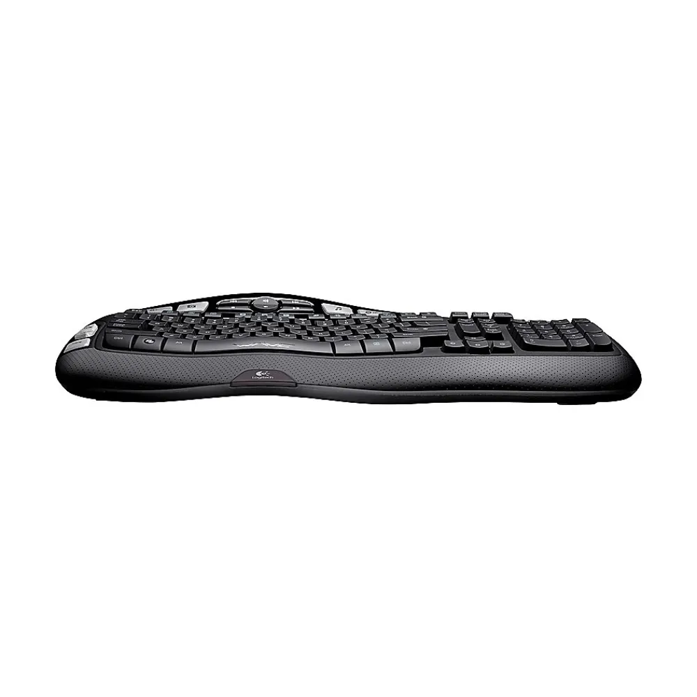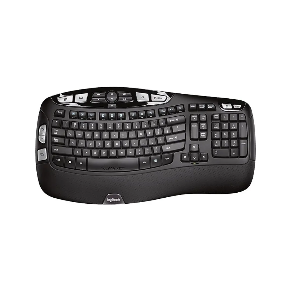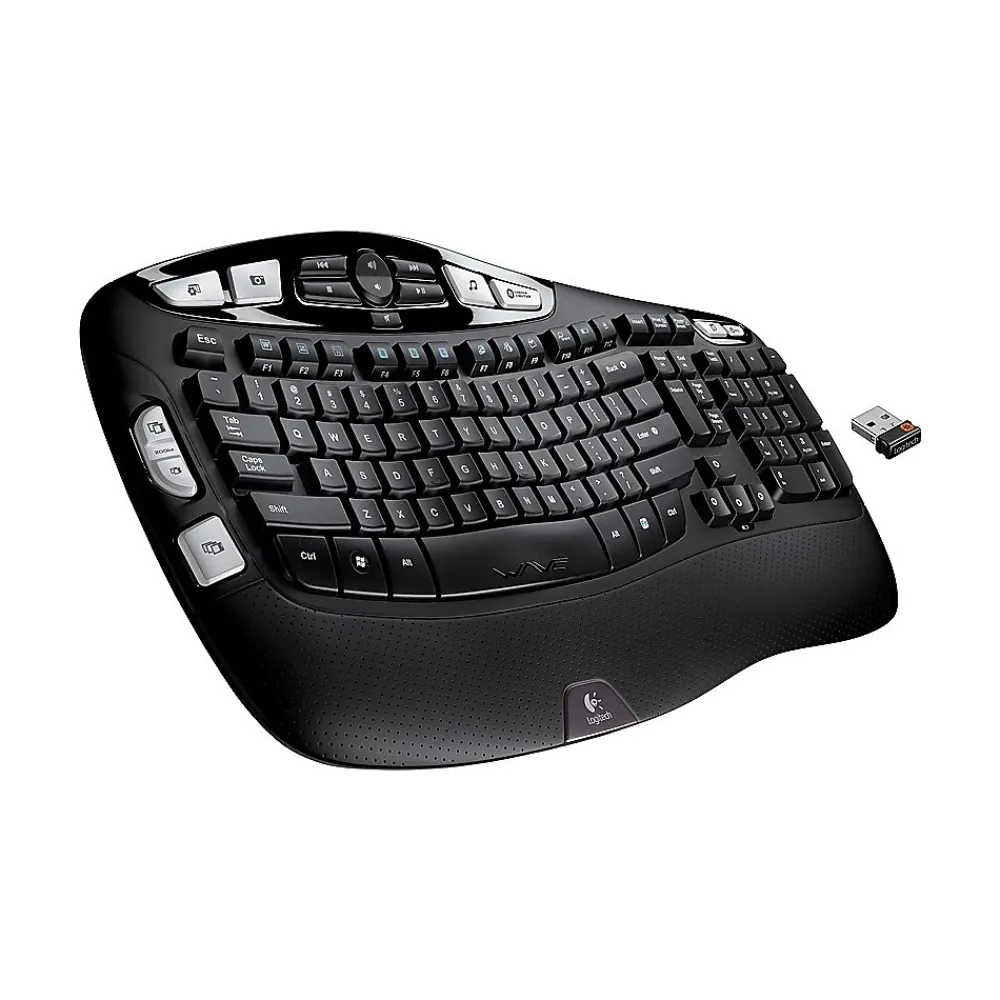 Give your wrists a rest with this Logitech Wireless Keyboard K350. A cushioned palm rest and curved design put your hands at the perfect angle for typing. Featuring programmable keys and convenient media buttons, along with a unique key layout, this Logitech Wireless Keyboard K350 puts essential controls at your fingertips.