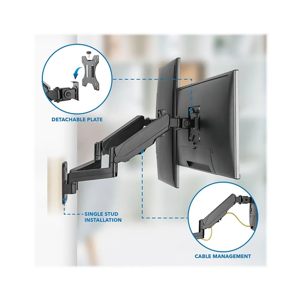 - Easily raise your monitor to an optimal viewing height, reducing the strain on your neck and shoulder while working with dual-monitor wall mount