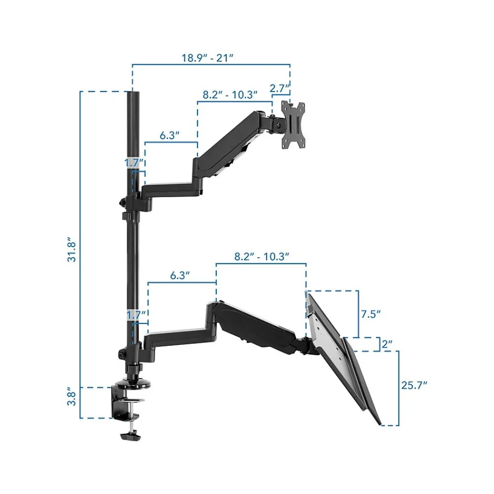 Mount your screen up to 32″ in size in either portrait or landscape orientation. The intuitive 25.7″ x 9.5″ keyboard tray underneath comes with a padded wrist rest to relieve additional stress on your wrists. Cable management system hides unwanted cables and wires from sight. The pneumatic counterbalance gas springs allow your monitor to tilt 35 degrees, swivel 180 degrees, and rotate 360 degrees so you can find the optimum viewing angles. Clamp or grommet onto your work desk.