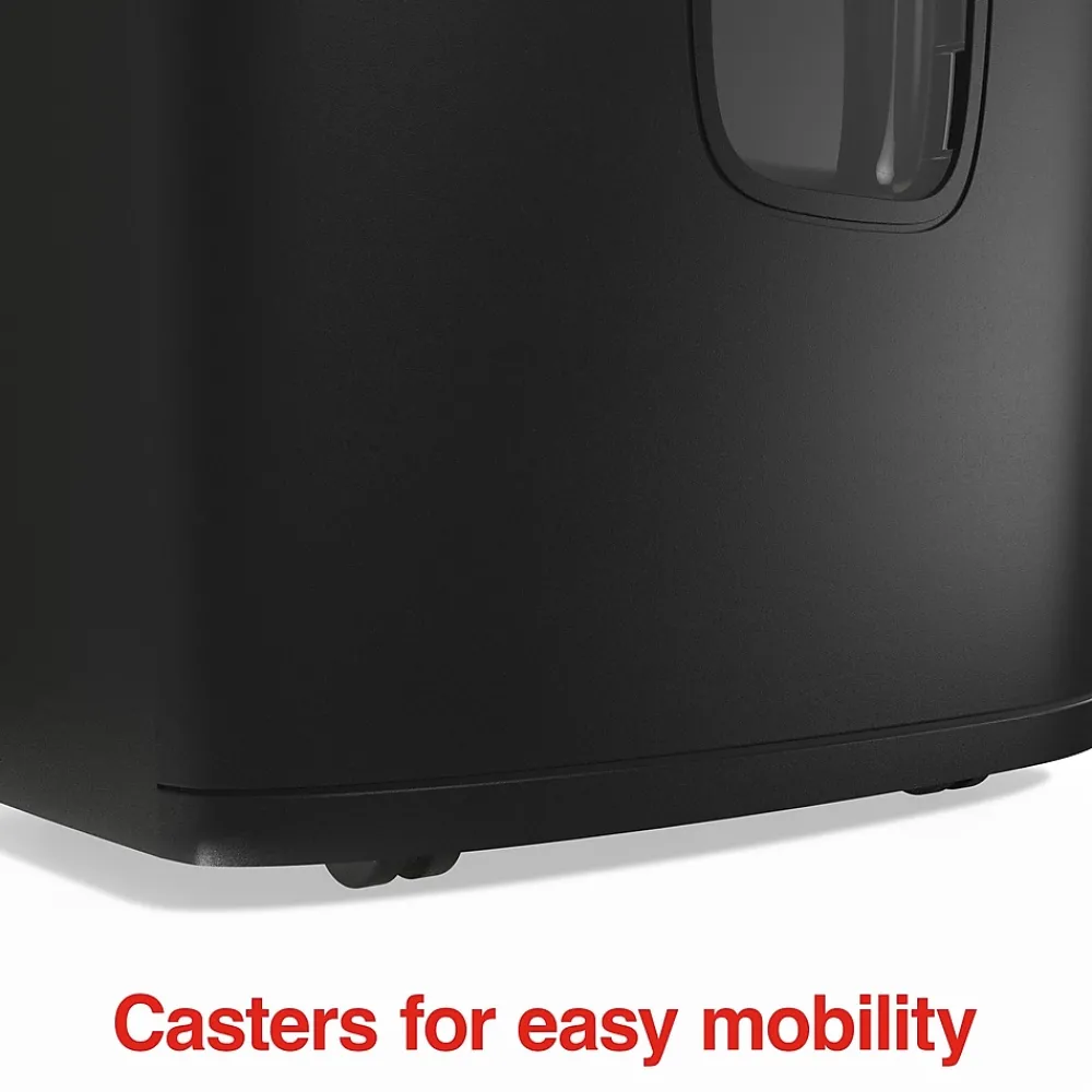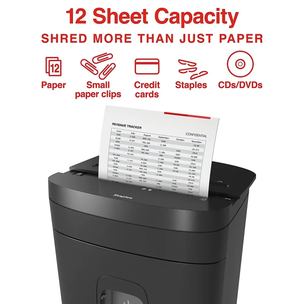 This compact, easy-to-empty Staples Micro-Cut Shredder features powerful blades to keep your disposed documents safe. With a P-4 security level rating designed for day-to-day personal paperwork and emails, this unit takes your data down to 4.3mm x 12mm pieces. The Staples 12-Sheet Micro-Cut Shredder can shred paper, credit cards, CDs/DVDs and staples for home and office use. Safety temperature indicators and auto reverse loading prevent jams and overheating so you can shred documents without wasting time.