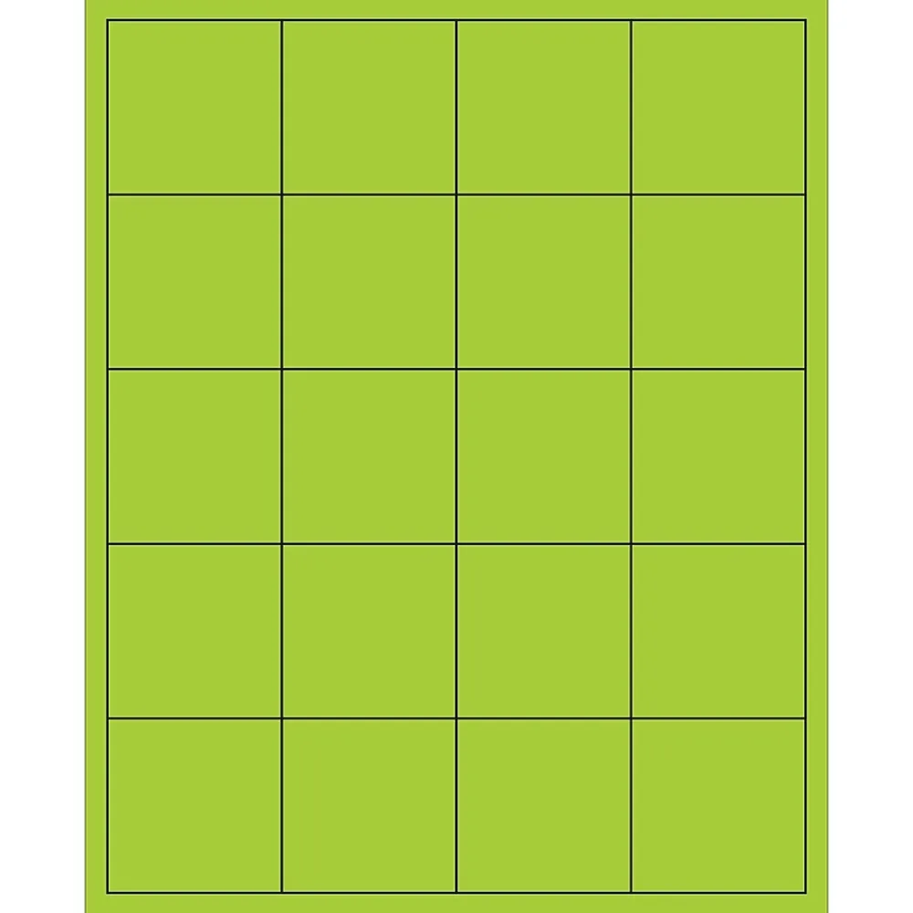 2″ x 2″ Fluorescent Green Rectangle Laser Labels. Use to create your own product or mailing labels. Labels work with both Laser and ink jet printers. Permanent adhesive. Labels stick to a variety of smooth surfaces including paper, corrugated, plastic, wood, glass and metal.