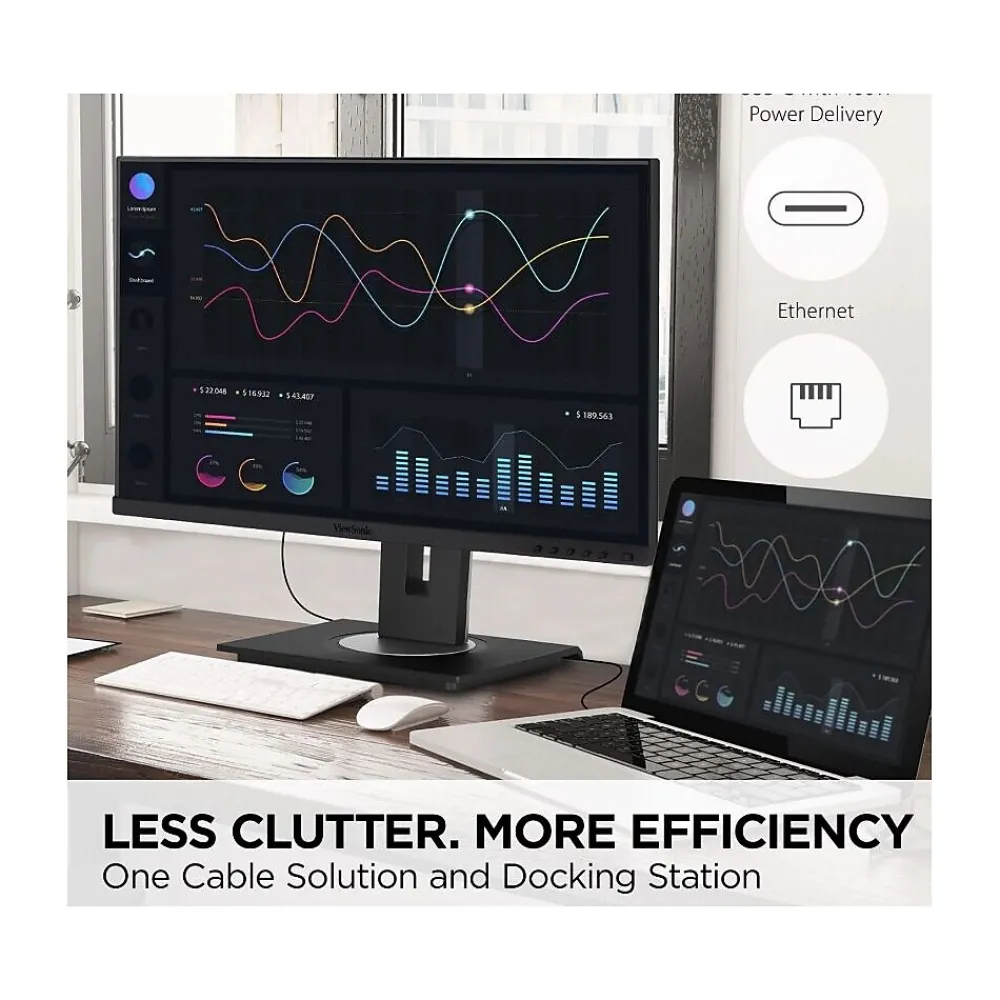 Designed to boost productivity and maximize output, the ViewSonic VG2756a-2K is a 27” QHD docking monitor that transforms your desktop into a streamlined and efficient workspace. Enjoy reliable and flexible network connectivity with the integrated gigabit Ethernet port, while the USB Type-C connectivity allows easy single-cable connectivity to provide data, audio, video and up to 100w power delivery. DisplayPort out allows easy Daisy Chain capability for a dual monitor set-up for additional screen real estate. That’s not all, the integrated USB hub allows easy connectivity for your peripherals and accessories. A best-in-class ergonomic design features 40-degree tilt and bi-directional pivot so your screen and workspace are as comfortable as you need. In addition, the included vDisplay software gives you quick and easy OSD control, as well as customized screen templates for easy multi-tasking. This monitor is also shipped in eco-friendly biodegradable packaging, along with an easy-to-install quick release stand that makes for quick deployment and a lower total cost of ownership.